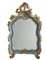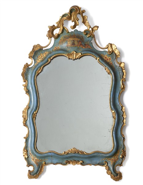 Piccola specchiera di forma mossa in legno intagliato, traforato, laccato e dorato. Cimasa centrata da figura orientale in una pagoda tra mazzi di fiori. Venezia, secolo XIX (cm 76x44,5) (difetti)