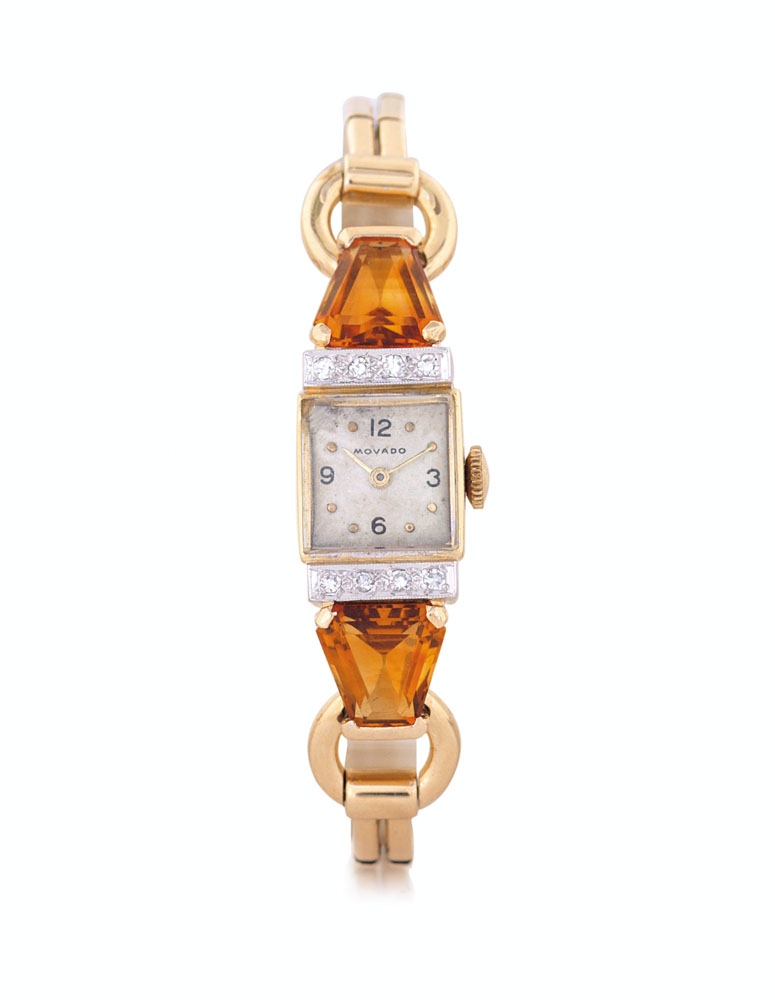 Cassa rettangolare in oro giallo 14 kt impreziosita da due file di brillanti e due quarzi arancioni taglio fantasia. Quadrante argentato con indici applicati e numeri arabi smaltati. Movimento a carica manuale.. Bracciale a due code con attacco ad anello in oro giallo 14 kt. Quadrante, cassa e movimento firmati.