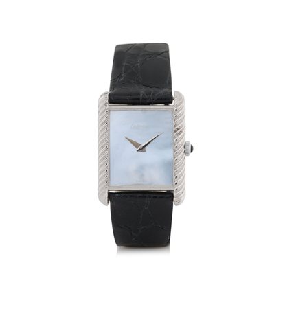Cassa rettangolare in oro bianco 18 kt con profili godronati e dedica incisa sul fondello del 1974. Quadrante in madreperla azzurra privo di indici. Movimento a carica manuale. Quadrante e cassa firmati. Completo di fibbia deployante in oro bianco 18 kt.