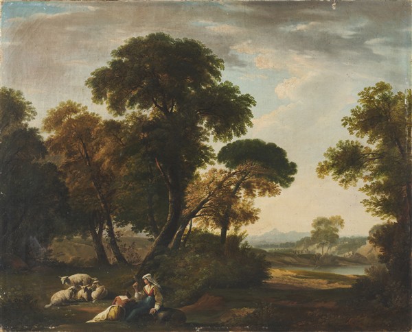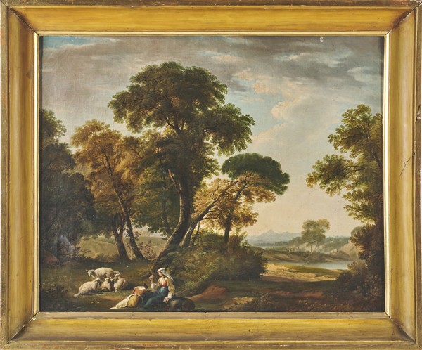 Scuola lombarda della fine del secolo XVIII "Paesaggio con pastorelle" olio su