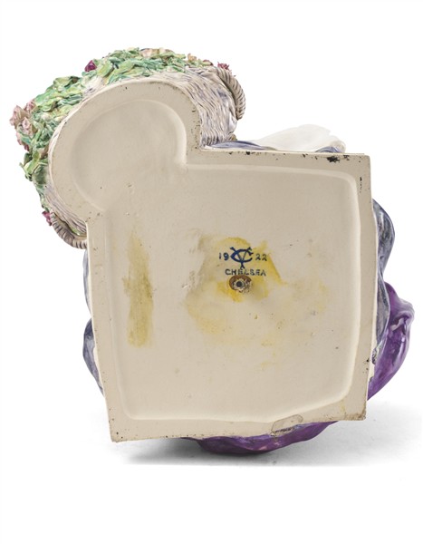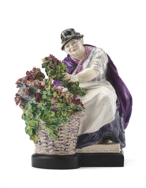 "Piccadilly rose woman", 1920-1930 circa. Polychrome ceramic figurere (h. cm 22,5), stained wooden support (h. tot cm 24) (minor defects)