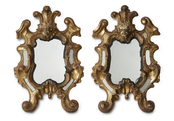 Coppia di specchierine di forma sagomata in legno intagliato e dorato a volute con inserti in vetro, cimasa con testa di cherubino a rilievo e grembiale a valva di conchiglia. Secolo XVIII (cm 22x32) (difetti)