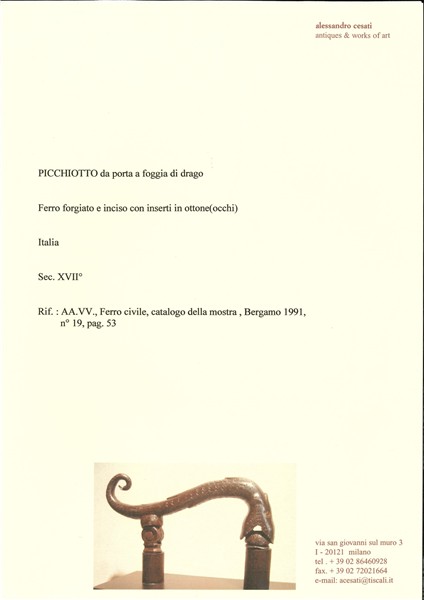 Arte del secolo XVII. Battente in ferro forgiato e inciso sagomato a forma di d