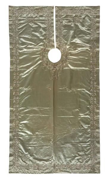Manifattura dell'Impero Ottomano, Turchia, secolo XVIII. Telo da barbiere realizzato in raso di seta color acquamarina broccato con fili d'argento e sagomato al collo (cm 186x100) (lievi difetti) Questo manufatto veniva utilizzato per la rasatura dello sposo il mattino del giorno delle nozze