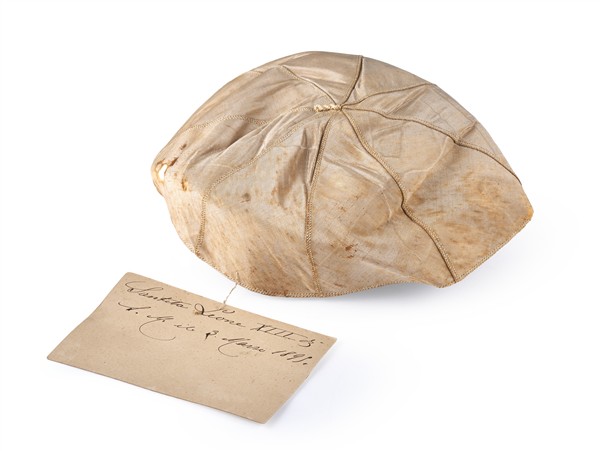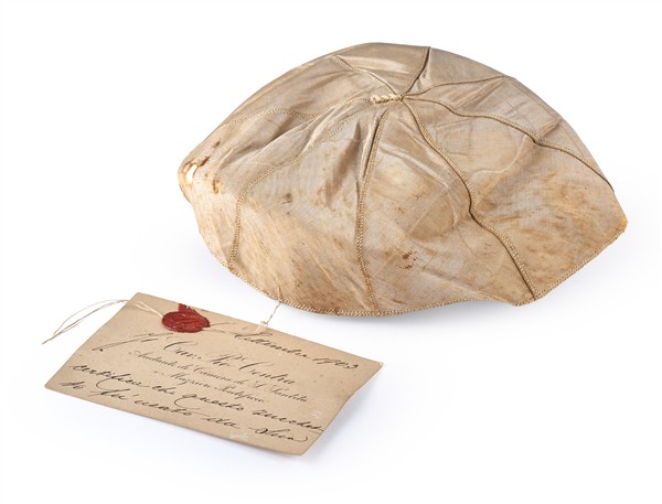 Zucchetto papale in seta bianca, appartenuto a Papa Leone XIII (1810-1903) legato tramite filo di cotone sigillato con ceralacca al biglietto da visita del Cav. Pio Centra, aiutante di camera di Sua Santità e Mazziere Pontificio e da lui manoscritto «Settembre 1903 / Il [...] certifica che questo zuc- / chetto fù usato da Sua (al verso) Santità Leone XIII / S. M. il 3 marzo 1898» (gravi difetti)