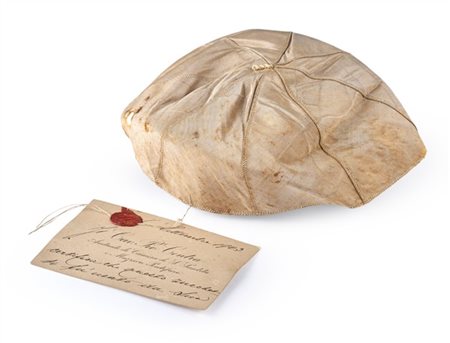 Papal skullcap or "zucchetto" in white silk, which belonged to Pope Leo XIII (1810-1903) tied with cotton thread sealed with sealing wax to the Cav's business card. Pio Centra, aide-de-chamber to His Holiness manuscript by him «Settembre 1903 / Il [...] certifica che questo zuc- / chetto fù usato da Sua (al verso) Santità Leone XIII / S. M. il 3 marzo 1898» (serious defects)