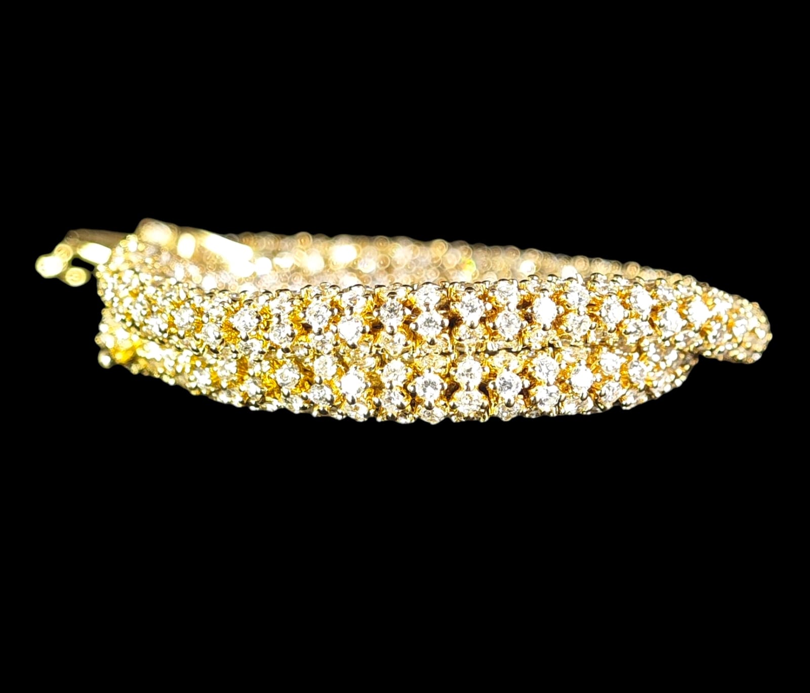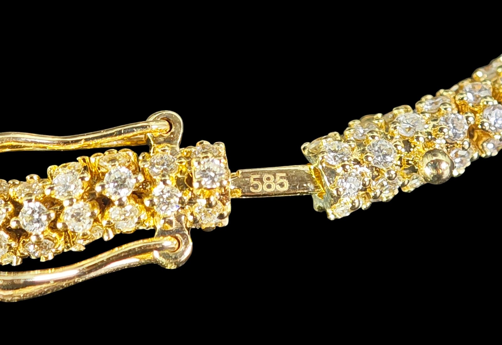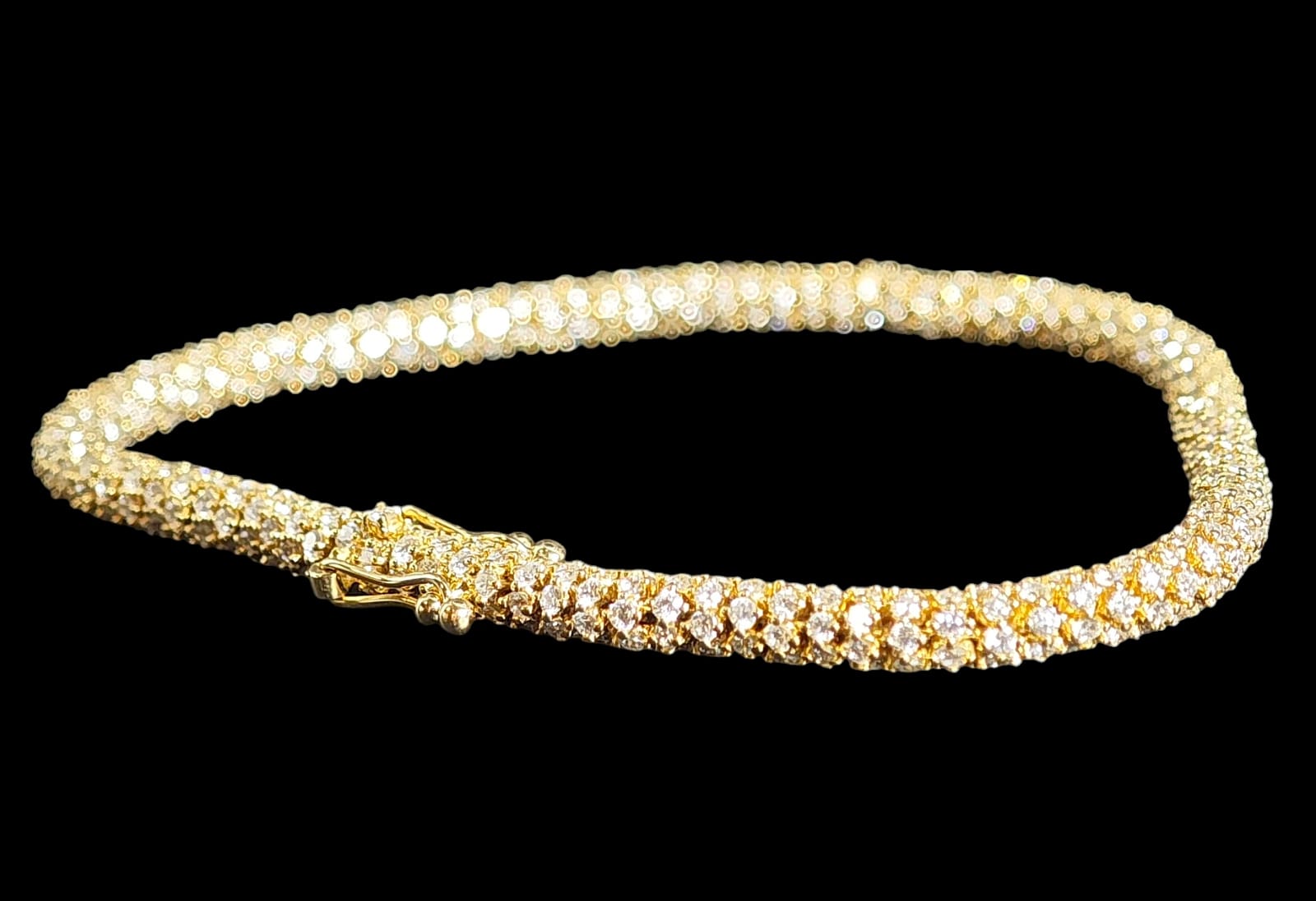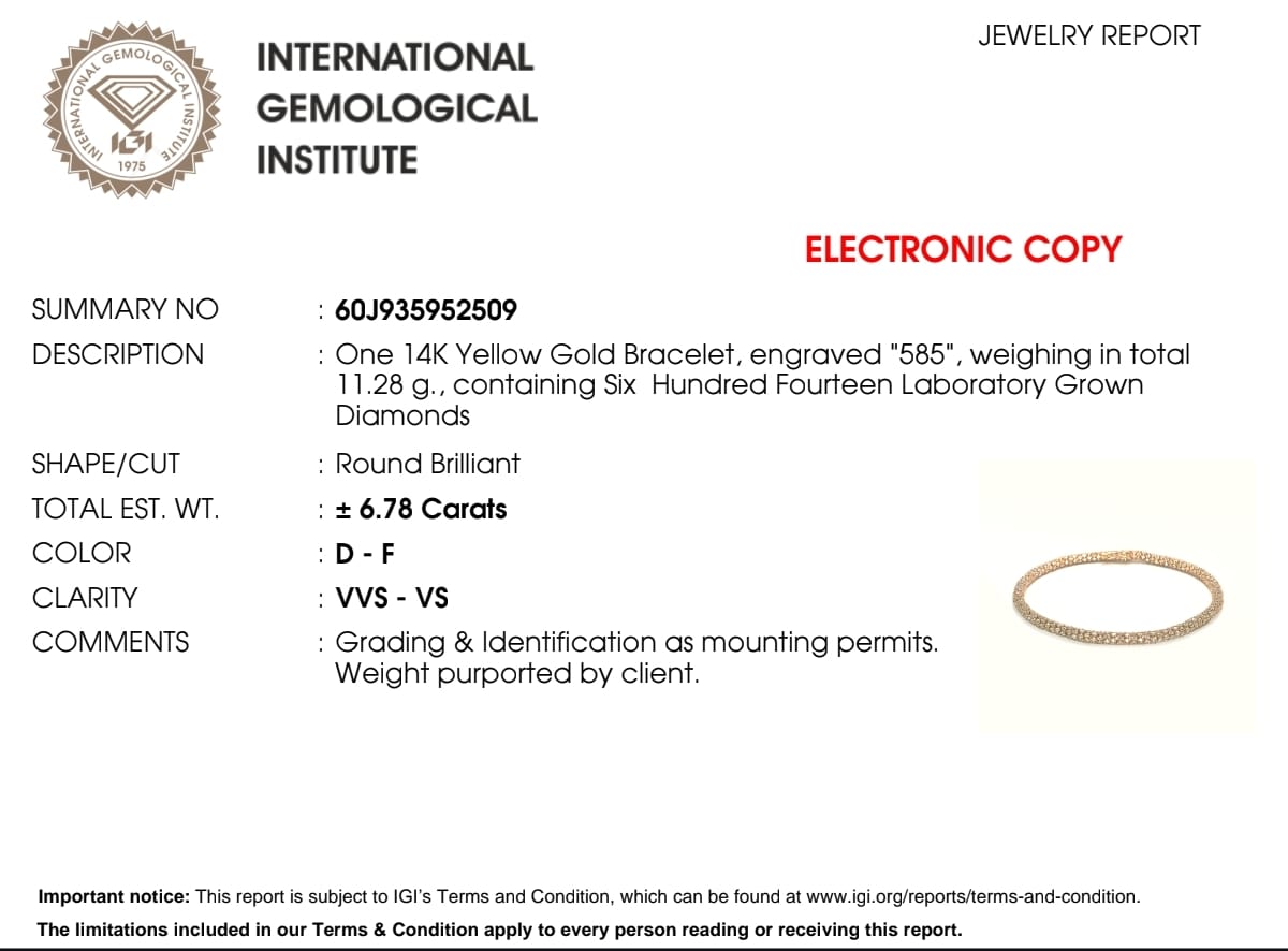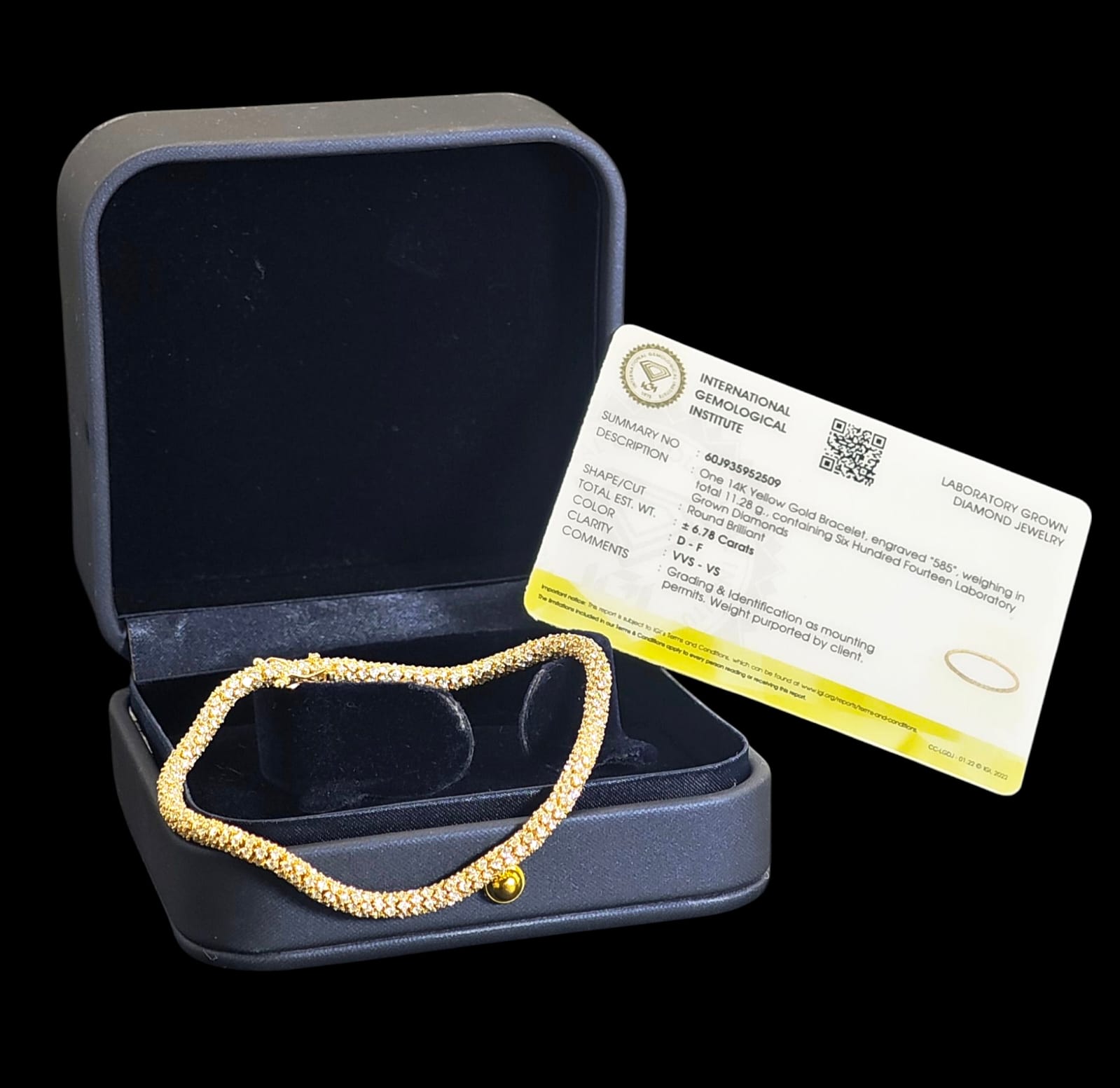 Un bracciale in oro giallo 14K, certificato IGI, con un design flessibile interamente incastonato con 614 diamanti lab-grown taglio brillante rotondo, con un peso totale stimato di 6.78 carati. I diamanti presentano un colore D-F e una purezza VVS-VS. Il bracciale si chiude con una chiusura a scatola, chiaramente marcata "585", e include due fermagli di sicurezza. Lunghezza: circa 18.5 cm Peso: 11.28 grammi - COMMISSIONE D’ASTA 25%