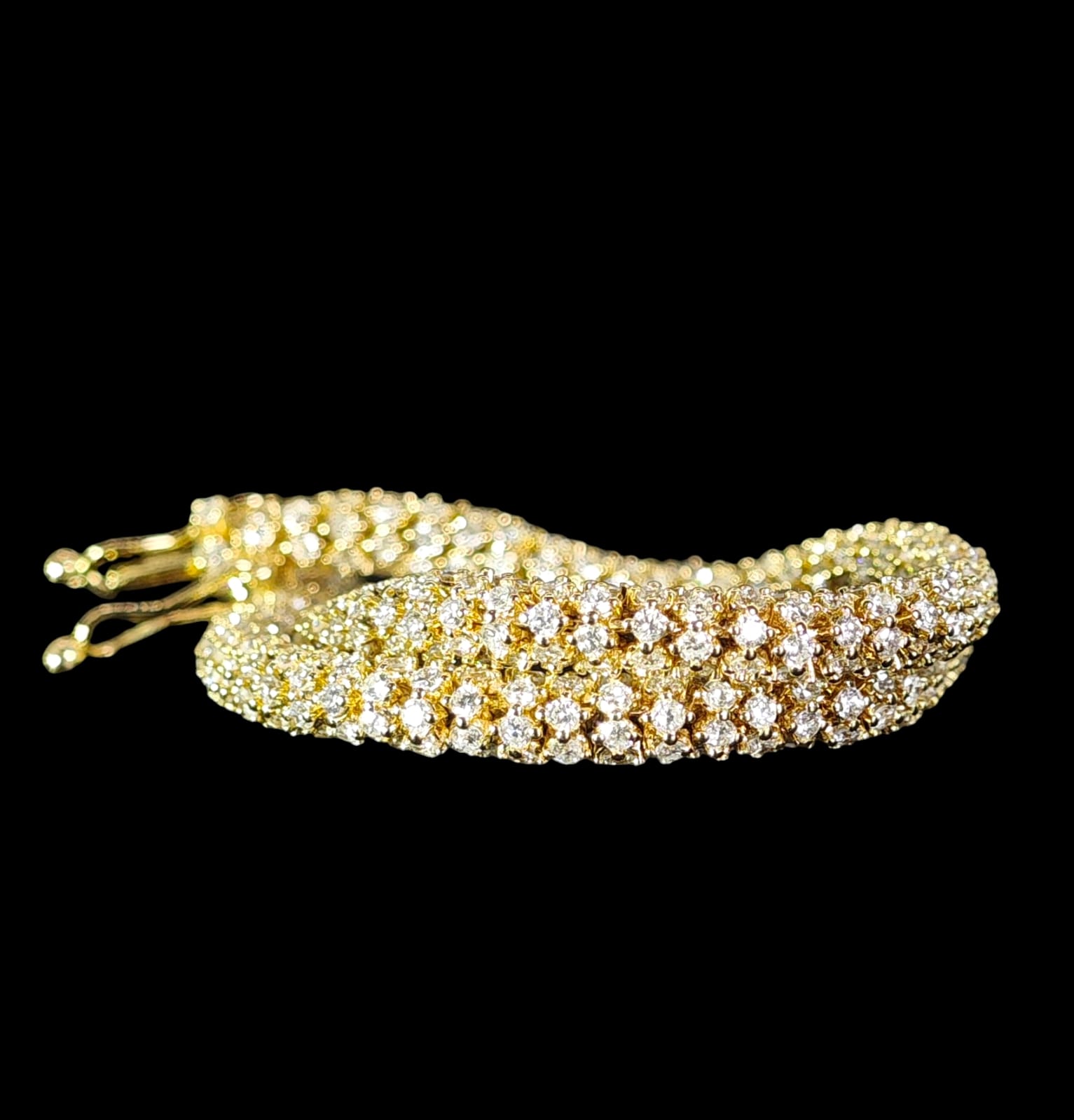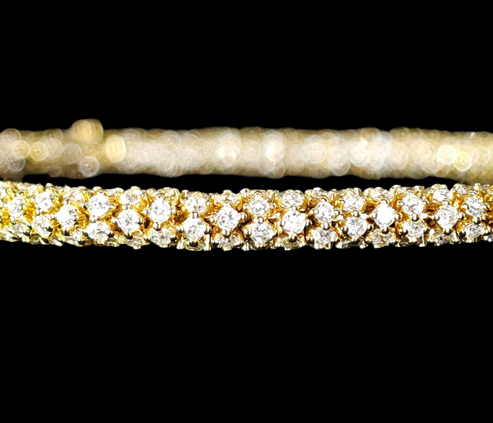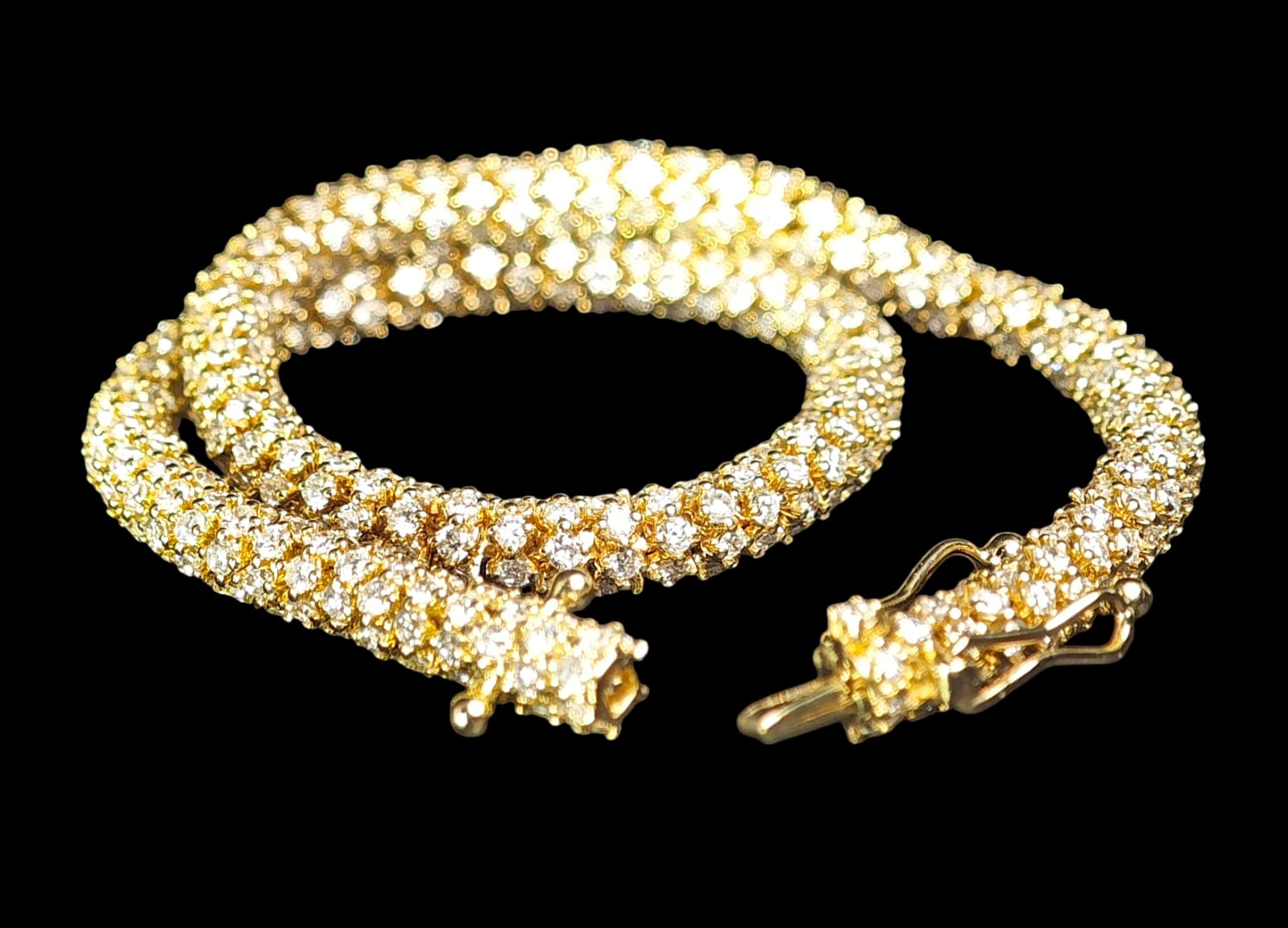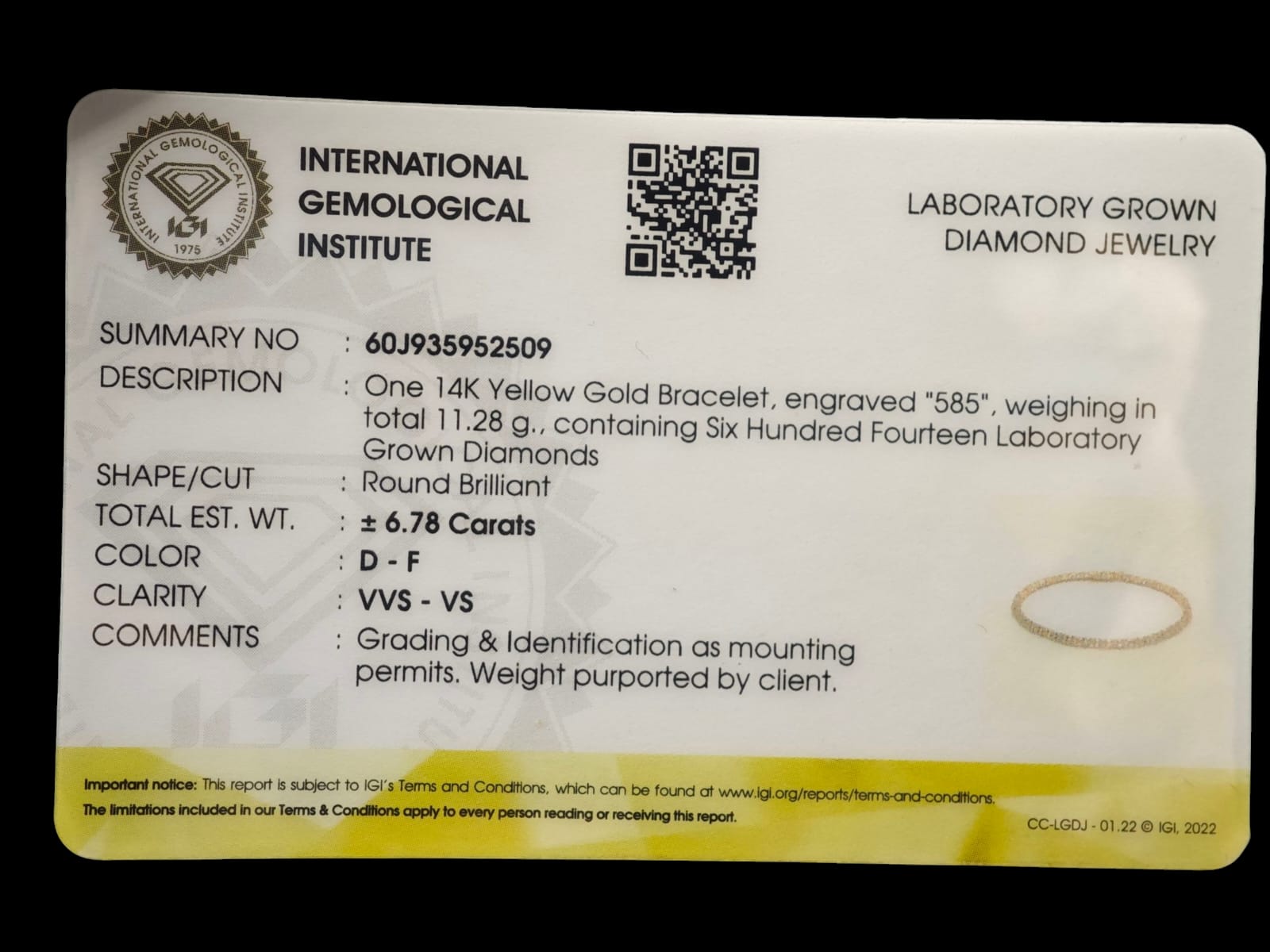Un bracciale in oro giallo 14K, certificato IGI, con un design flessibile interamente incastonato con 614 diamanti lab-grown taglio brillante rotondo, con un peso totale stimato di 6.78 carati. I diamanti presentano un colore D-F e una purezza VVS-VS. Il bracciale si chiude con una chiusura a scatola, chiaramente marcata "585", e include due fermagli di sicurezza. Lunghezza: circa 18.5 cm Peso: 11.28 grammi - COMMISSIONE D’ASTA 25%