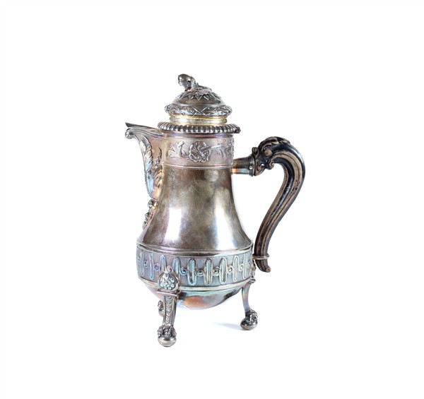 Caffettiera in argento decorata a sbalzo da baccellature e motivi vegetali, coperchio con presa a tutto tondo in foggia di ghianda, base a decori geometrici, piedi ferini che trattengono sfera, ansa in legno ebanizzato. Inizio secolo XIX, punzoni di importazione francesi (1819-1838) (g lordi 750) (h. cm 27) (difetti)