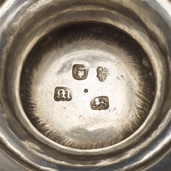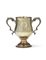 Coppa trofeo biansata in argento inciso con motto iscritto "VERITAS VINCIT" e monogramma coronato, anse a volute fogliate e base circolare gradinata con profilo cordonato. Londra, 1767. Argentiere I.R. (g 800) (cm 23x20) (difetti)