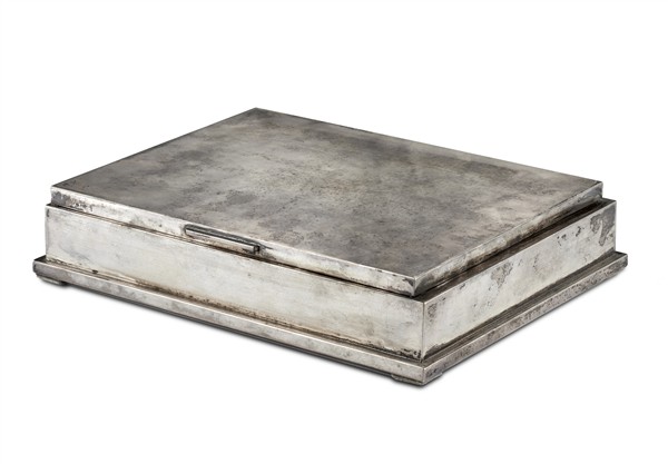 Cofanetto portagioie in argento di forma squadrata iscritta Evelina, scomparti