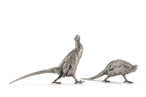 Due figure di fagiano in argento fuso e inciso. Milano, secolo XX. Argentiere M
