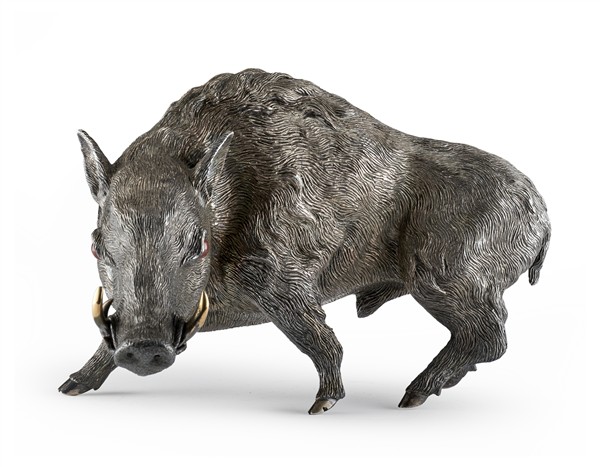 Orafo del secolo XX. Scultura di cinghiale a tutto tondo in argento inciso, zan