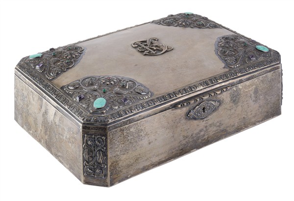 Scatola portagioie in argento inciso e sbalzato con decori a volute fogliate e inserti in pietre dure, coperchio centrato da monogramma a rilievo, interno in legno. Vienna, secolo XX. Argentiere E.G. (g lordi 2600) (cm 33x8x23) (difetti)