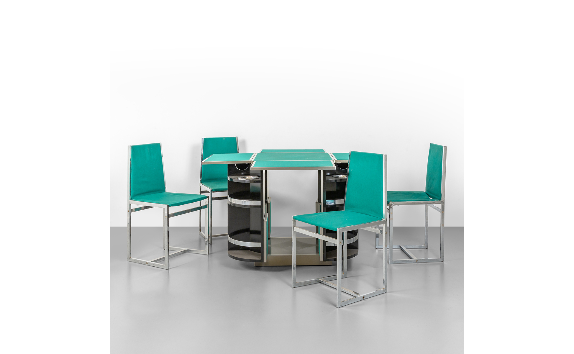 Un tavolo da gioco trasformabile 'Cubo' e quattro sedie.