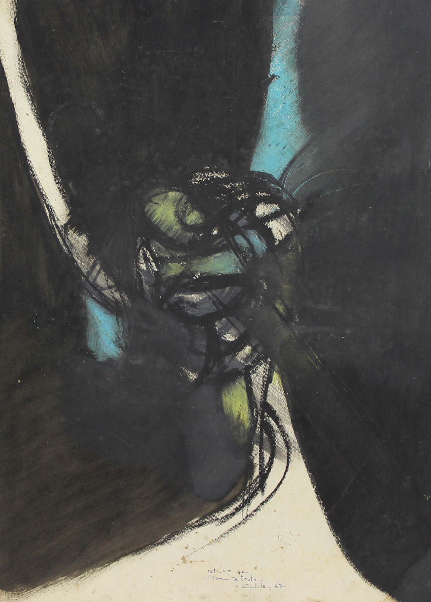 Cardile Andrea Studio per Mani e Testa, 1963 tecnica mista su carta, cm. 66x48 firmata, datata e intitolata in basso al centro, l'opera presenta due piccoli strappi, uno al margine inferiore e l'altro al margine destro senza cornice