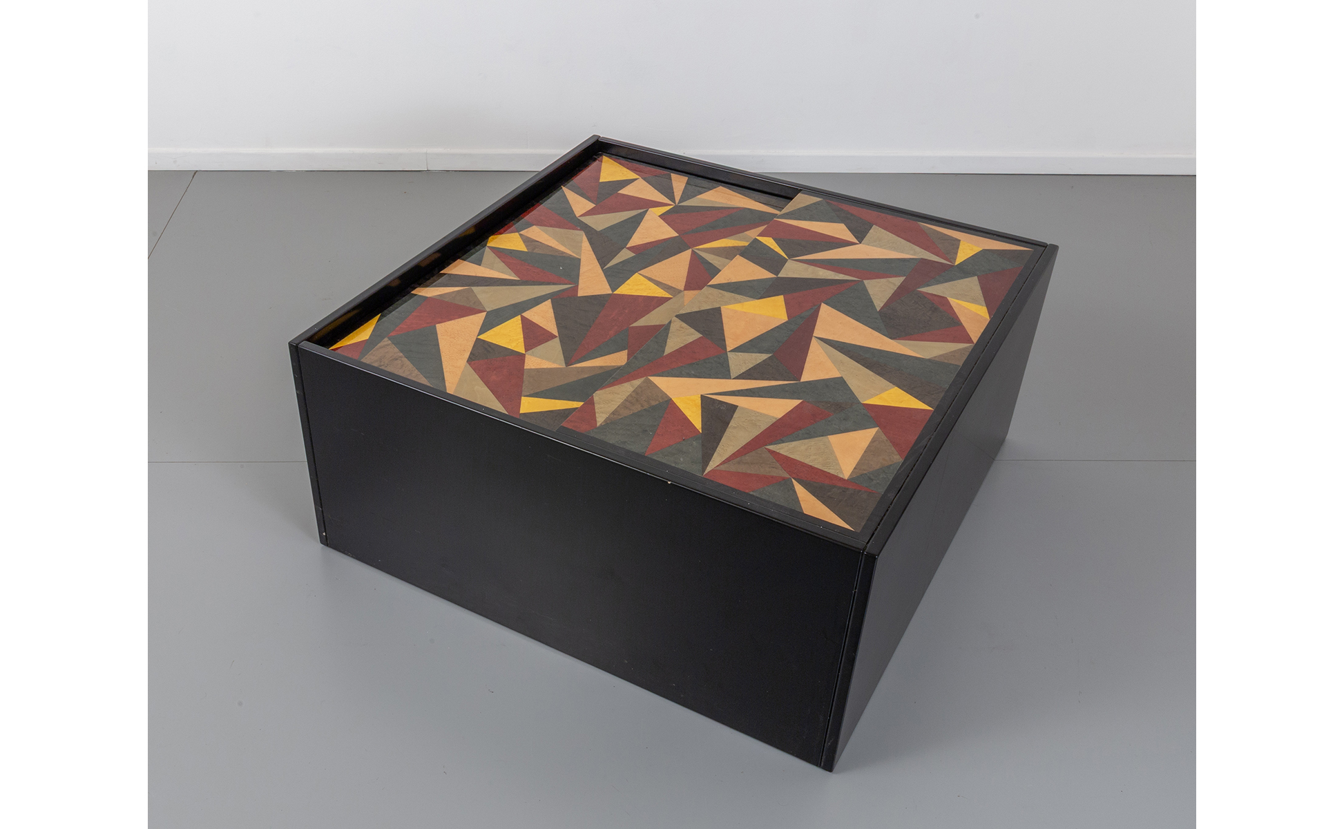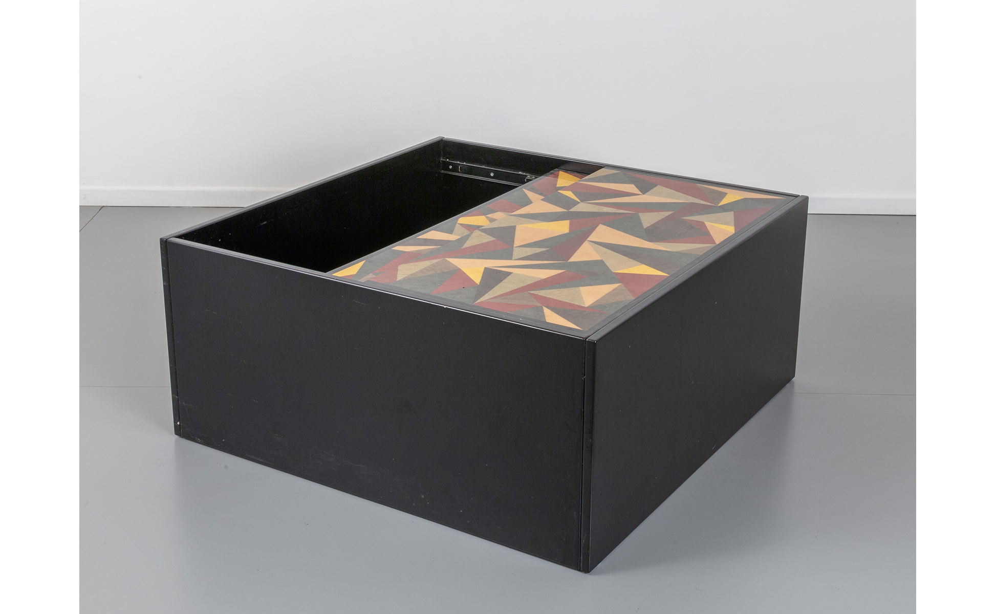 Legno laccato piano con anta scorrevole realizzata con ritagli di radica tinti all'anilina.