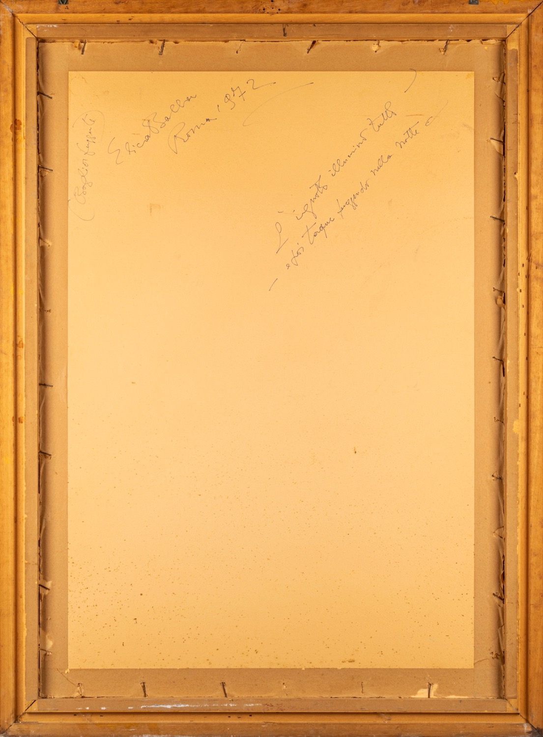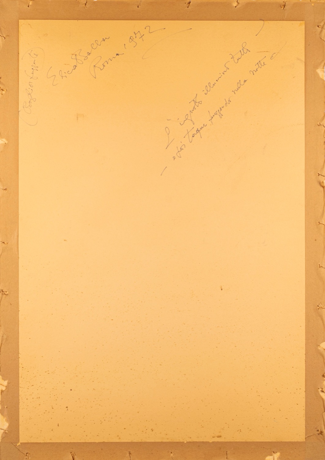 al retro, intitolato, firmato, locato e datato; scritta di mano dell'artista: L'ignoto illuminò tutto / e poi tacque fuggendo nella notte