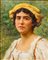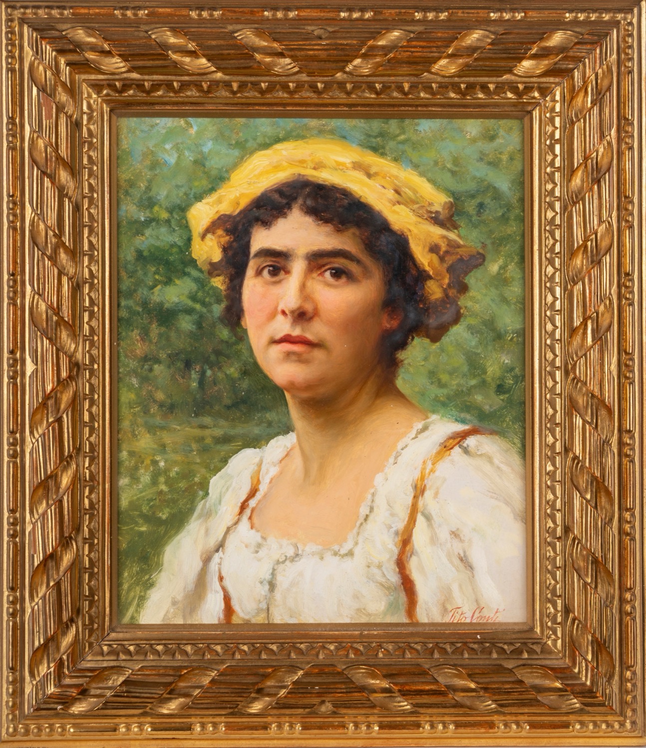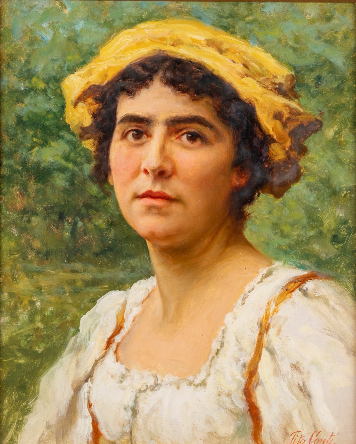 Tito Conti (Firenze 1842 - 1924) - Ritratto di donna con copricapo giallo