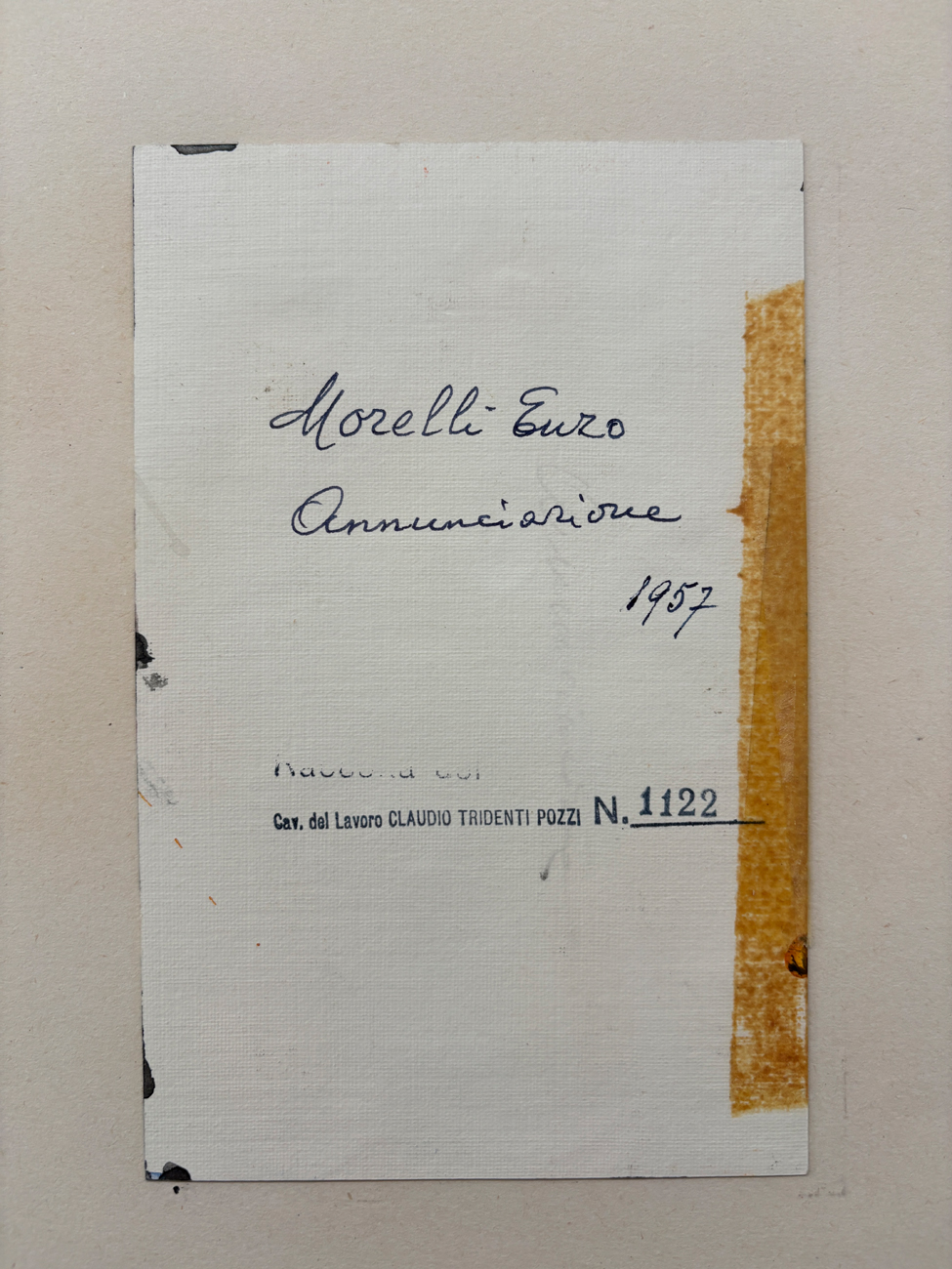 Timbro della Raccolta Claudio Tridenti Pozzi con numero di repertorio al retro