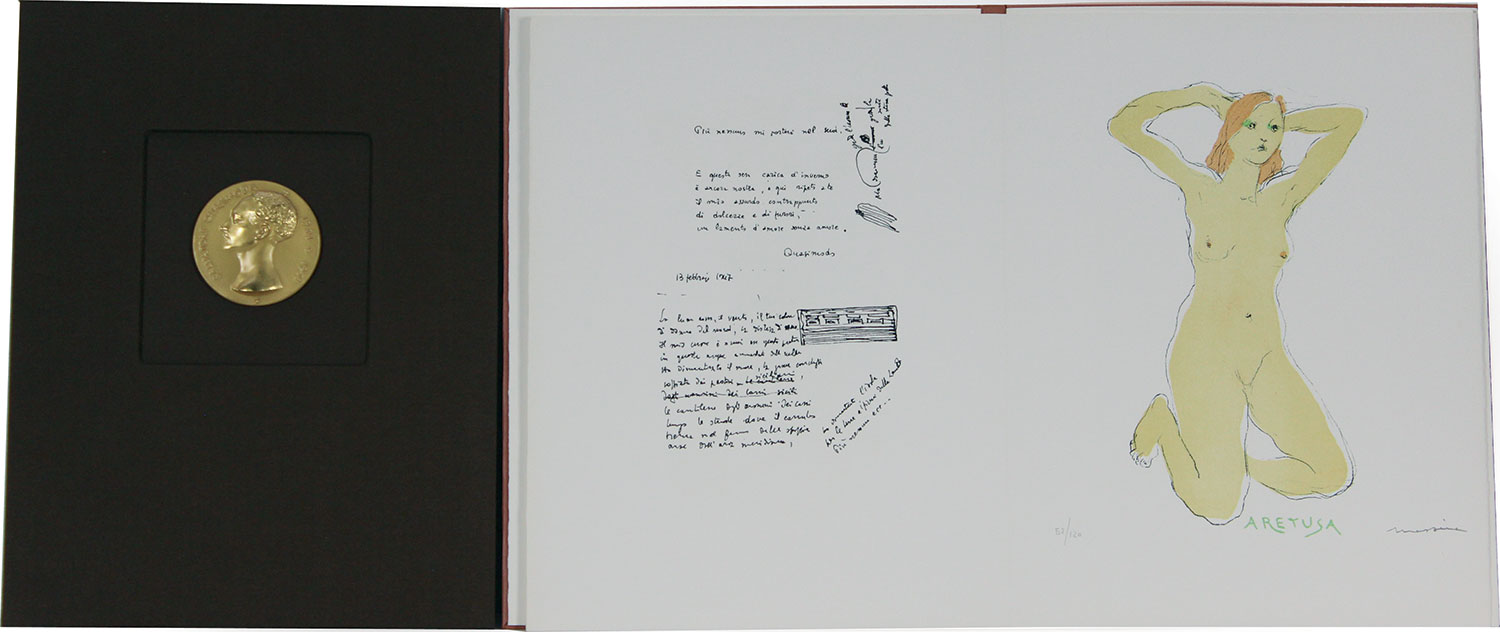 Messina Francesco Messina Illustra Quasimodo: Lamento per il Sud volume contenente 3 litografie e una medaglia in bronzo dorato, medaglia diam. cm. 8, litografie cm. 39x30, es. 97/120 litografie firmate in basso a destra, firma incisa sulla medaglia in basso a destra, Edizioni Franco Sciardelli di Milano
