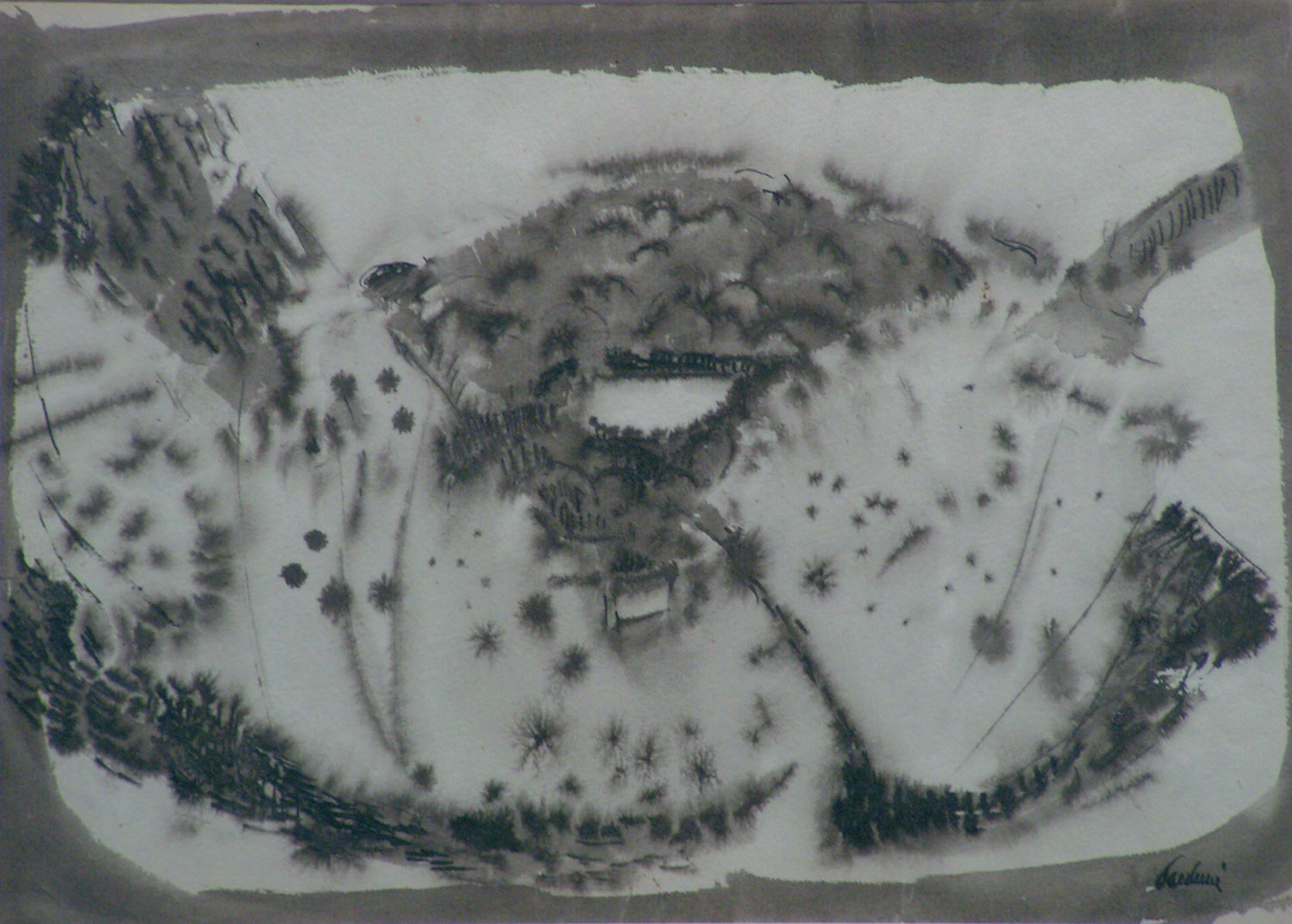 Paulucci Enrico Paesaggio guazzo in bianco e nero su carta antica, cm. 29,5x41 firmato in basso a destra, certificato di autenticità ed archiviazione dell'Archivio delle Opere di Enrico Paulucci su fotografia datato 2009