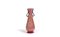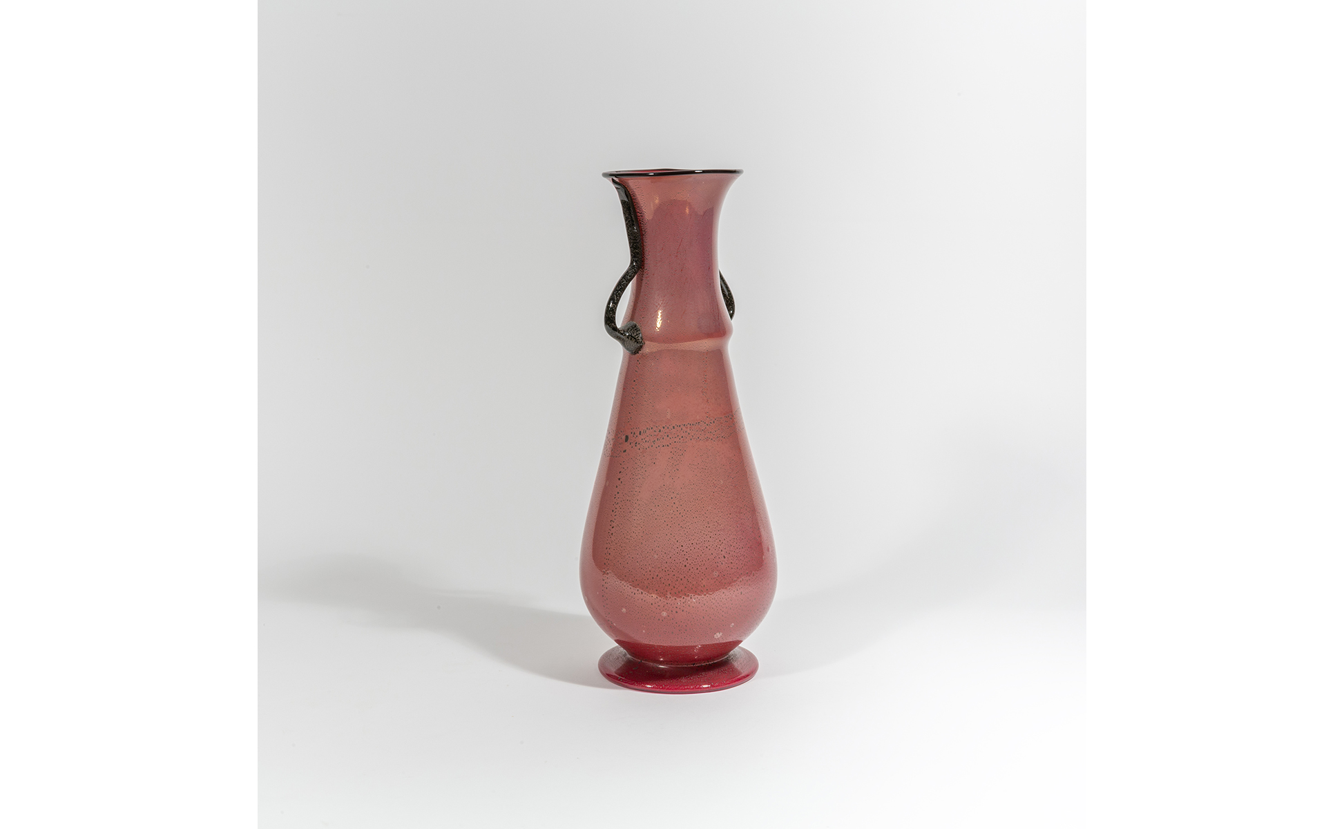 Un vaso in vetro viola con due anse e bordo collo in pasta vitrea nera superficie ricoperta di foglia d'argento.