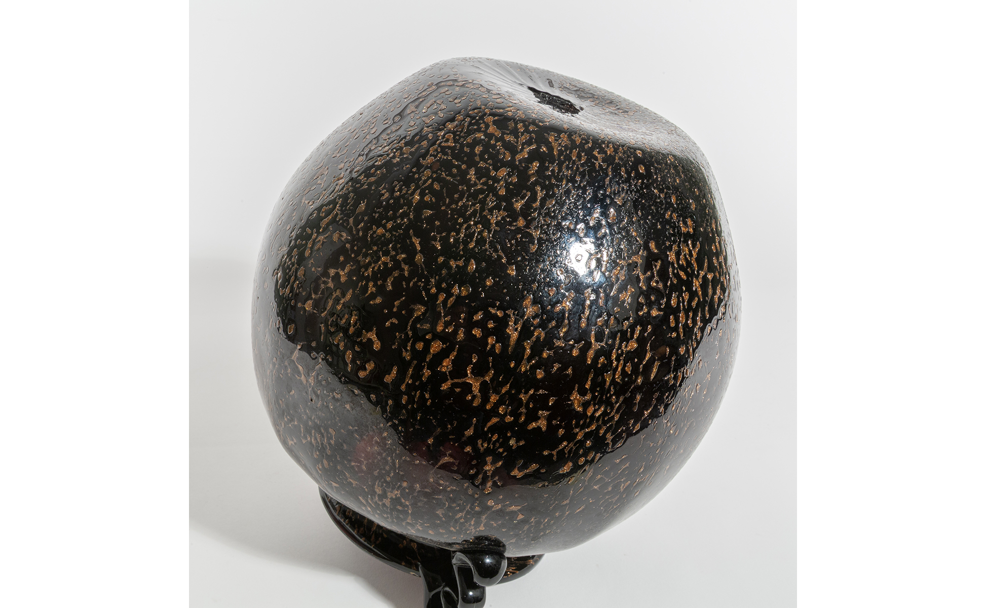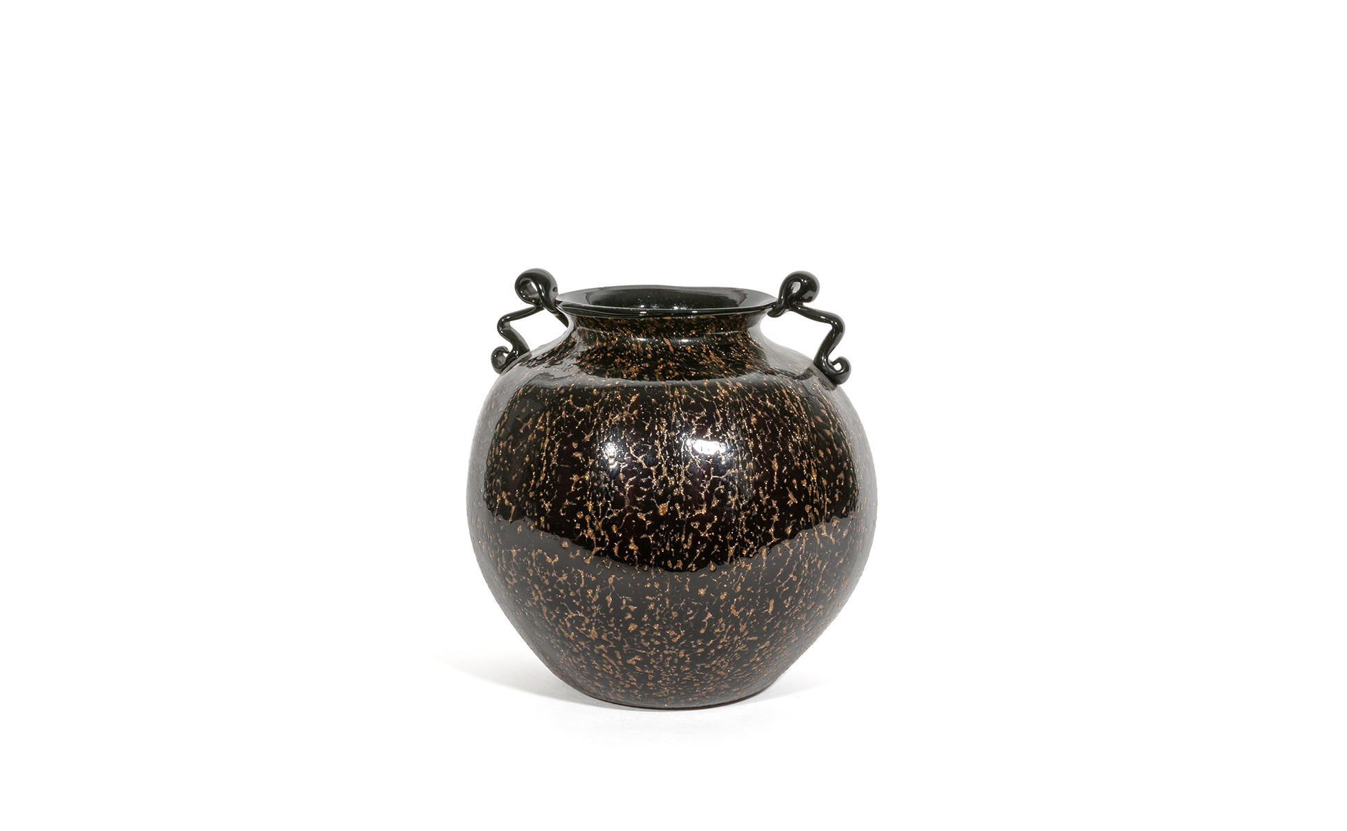 Un vaso nero con due anse a nastro e decoro di graniglie sparse di avventurina.