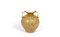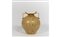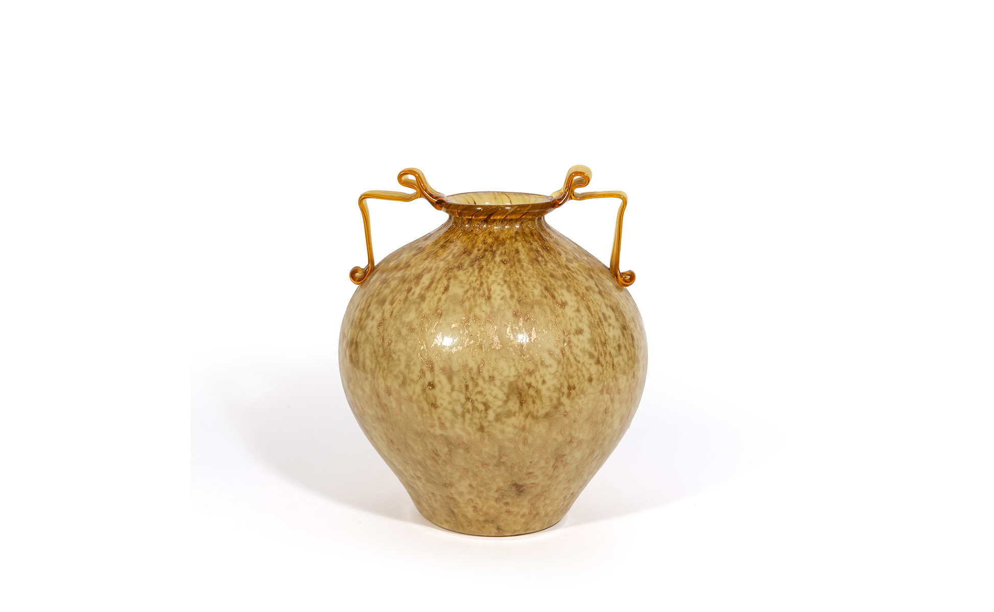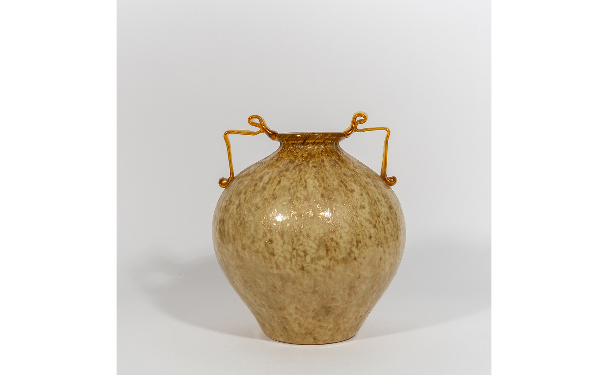Un vaso ambra con macchie lattimo con due anse a nastro e decoro di graniglie sparse di avventurina.