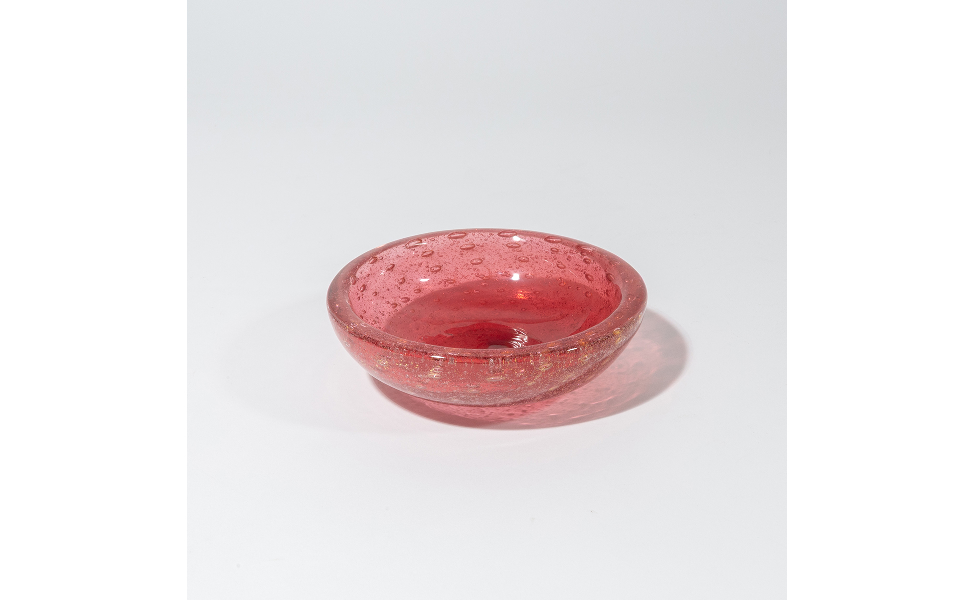 Una coppa rotonda color rubino a bollicine e foglia oro.