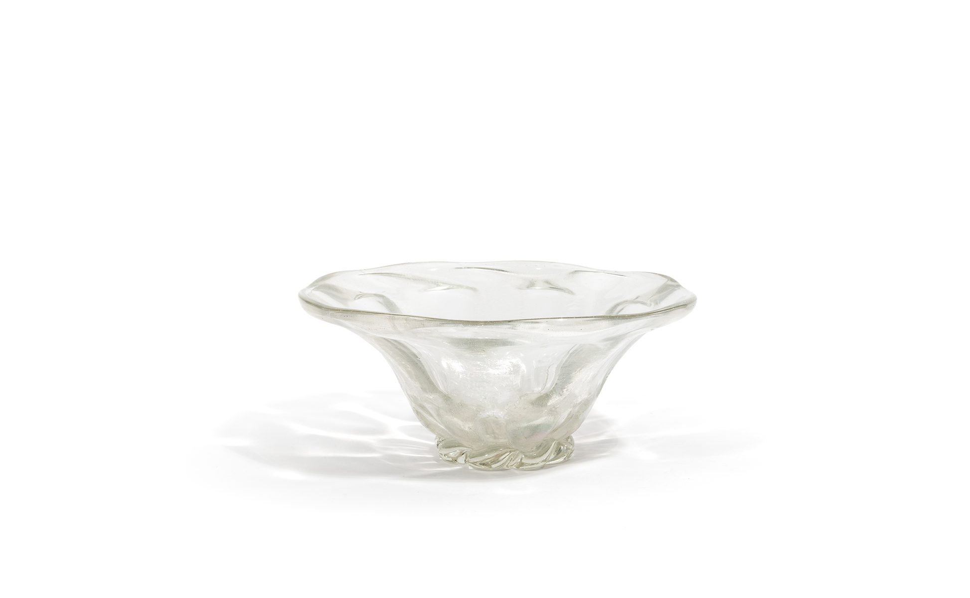 Una coppa in cristallo fortemente iridato con finestre trasparenti regolari ottenute a stampo.