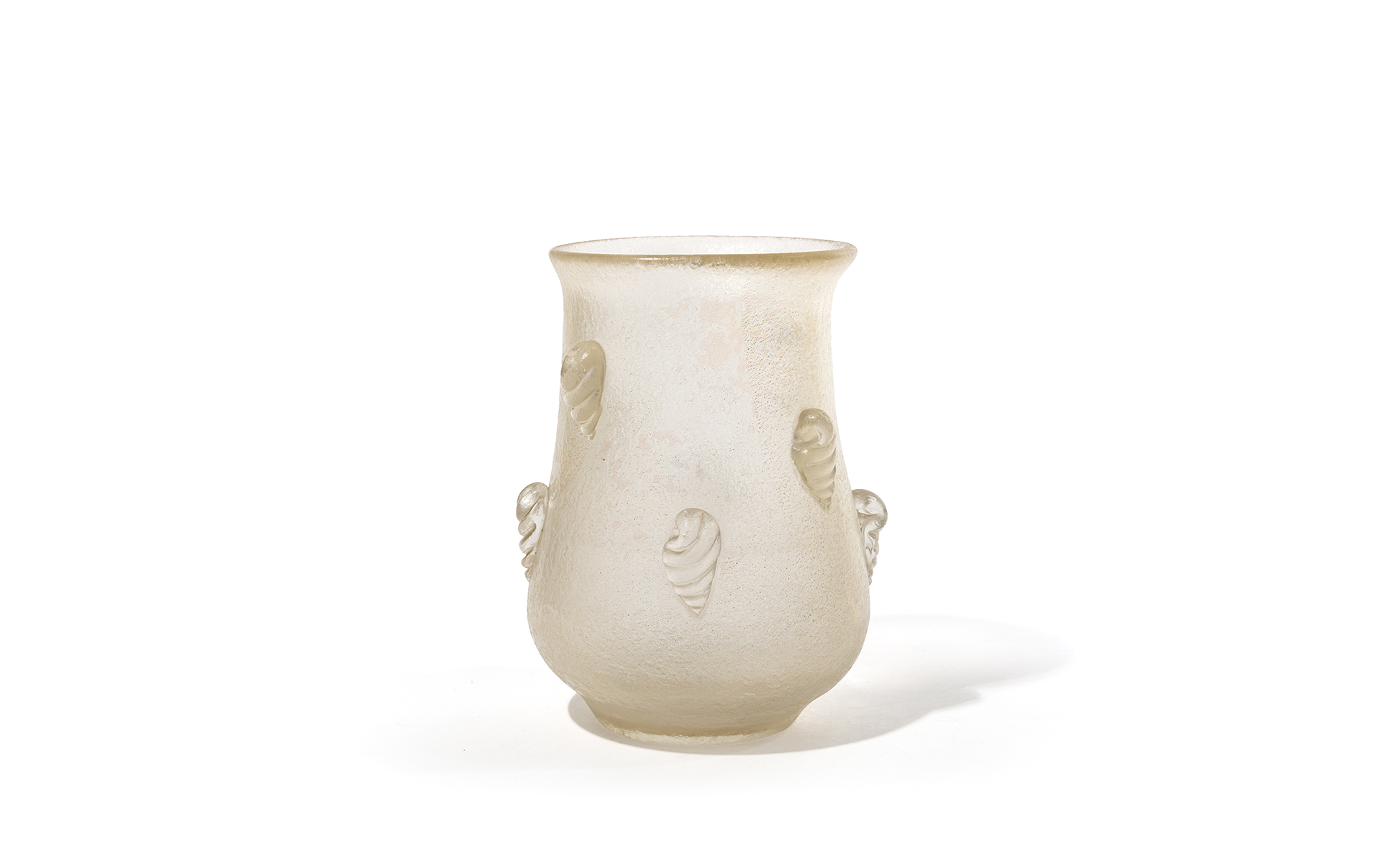 Un vaso in cristallo corroso e foglia oro con decoro di conchiglie in rilievo.