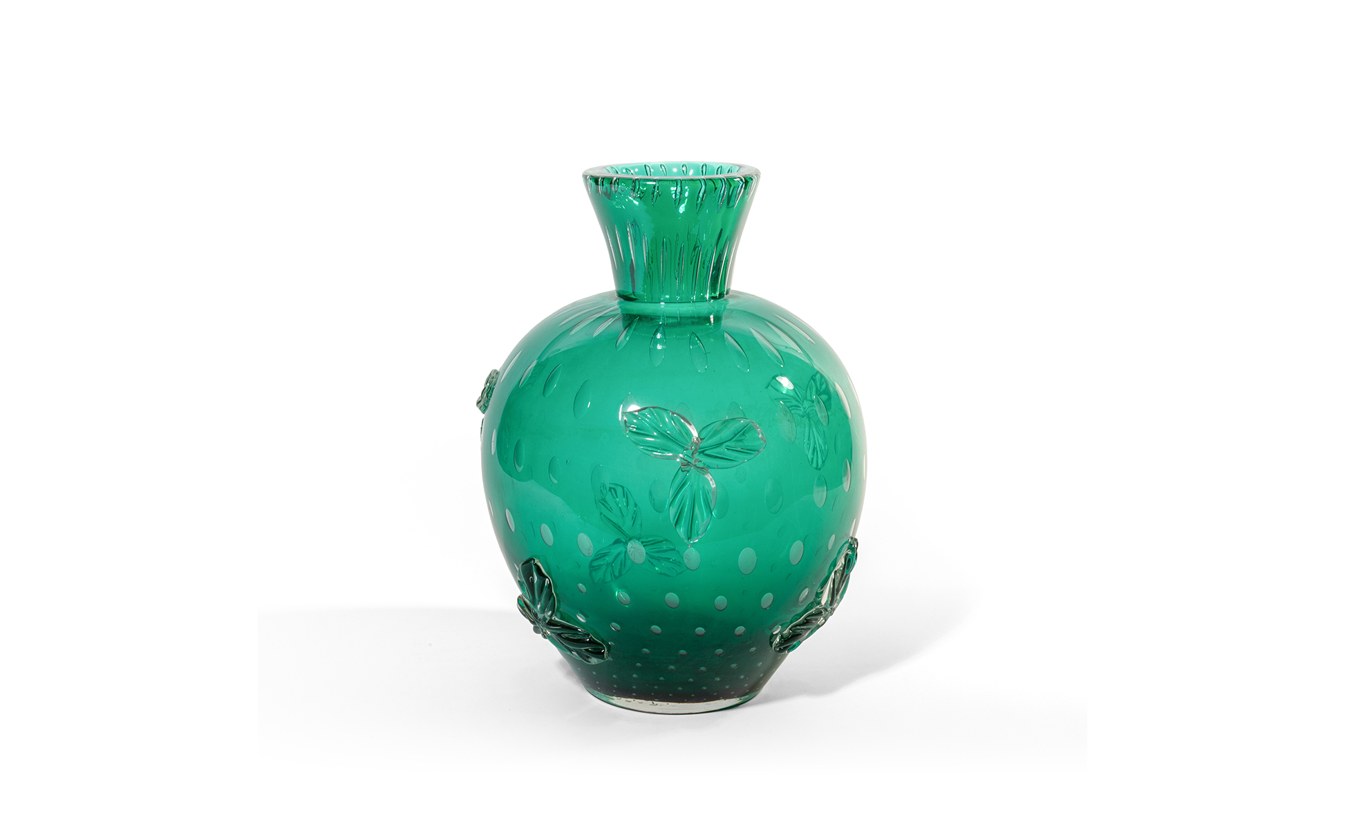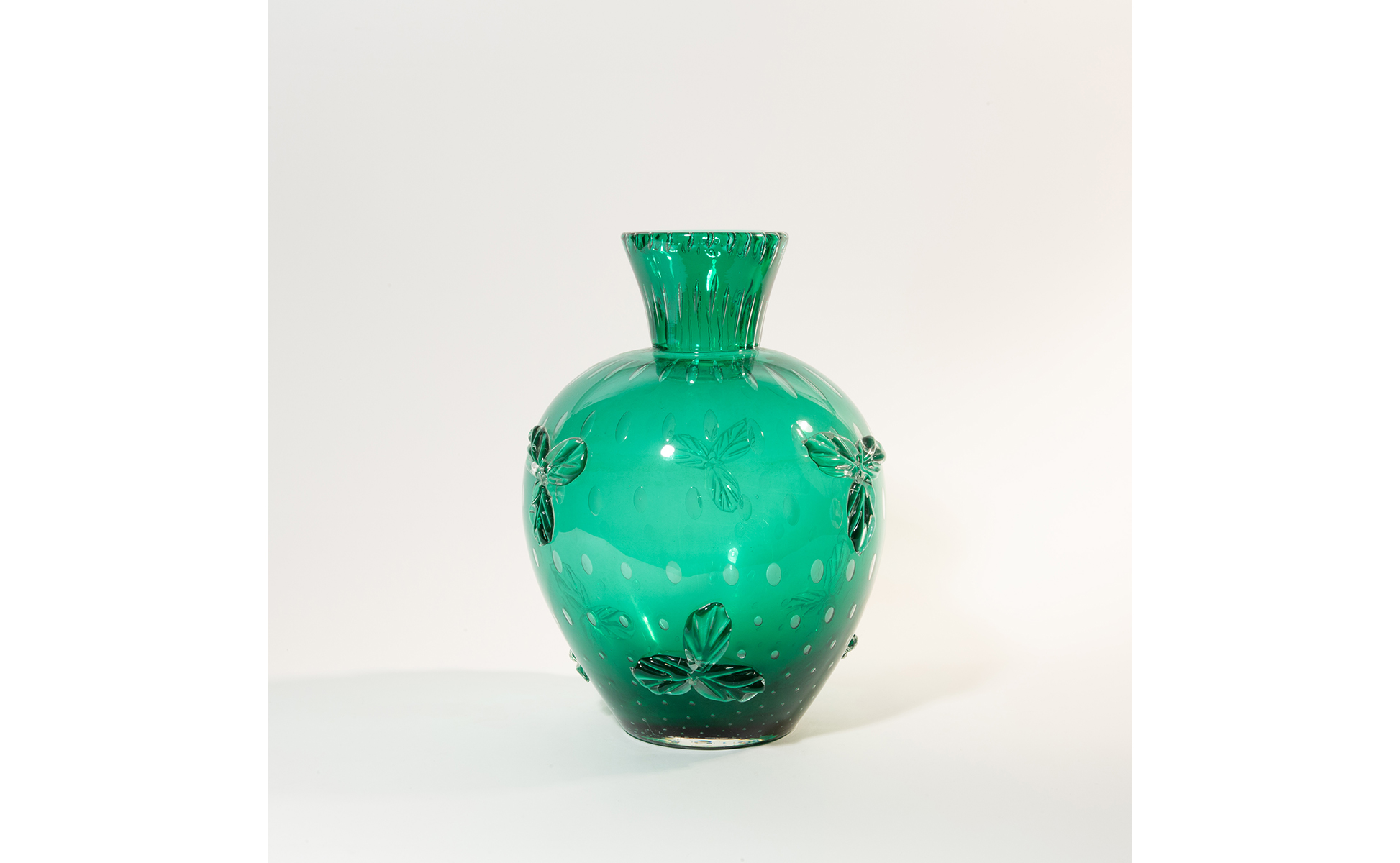 Un vaso in vetro trasparente verde a bolle regolari con decoro di trifoglio in rilievo.