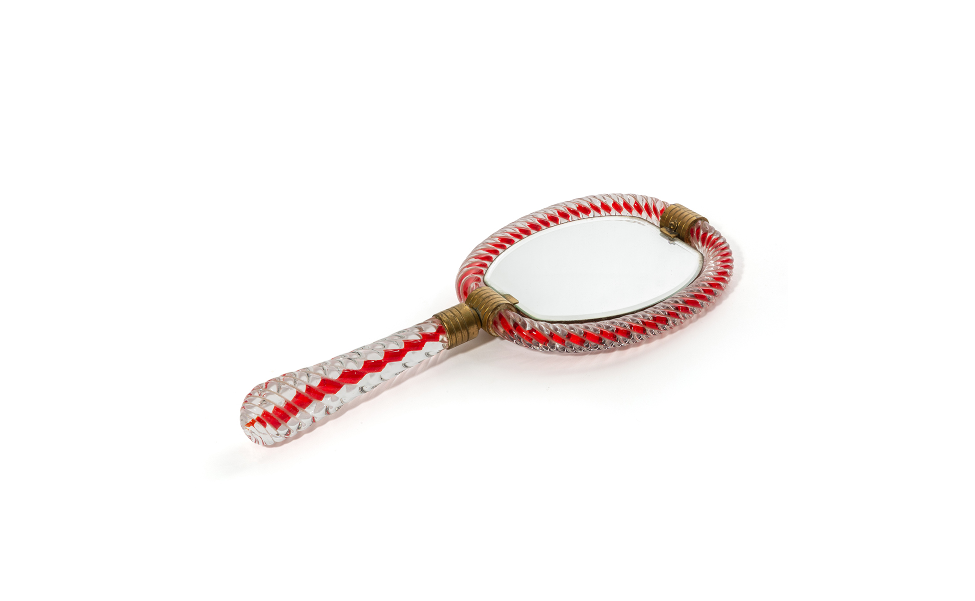 Uno specchio a mano in cristallo ritorto e anima interna corallo.
