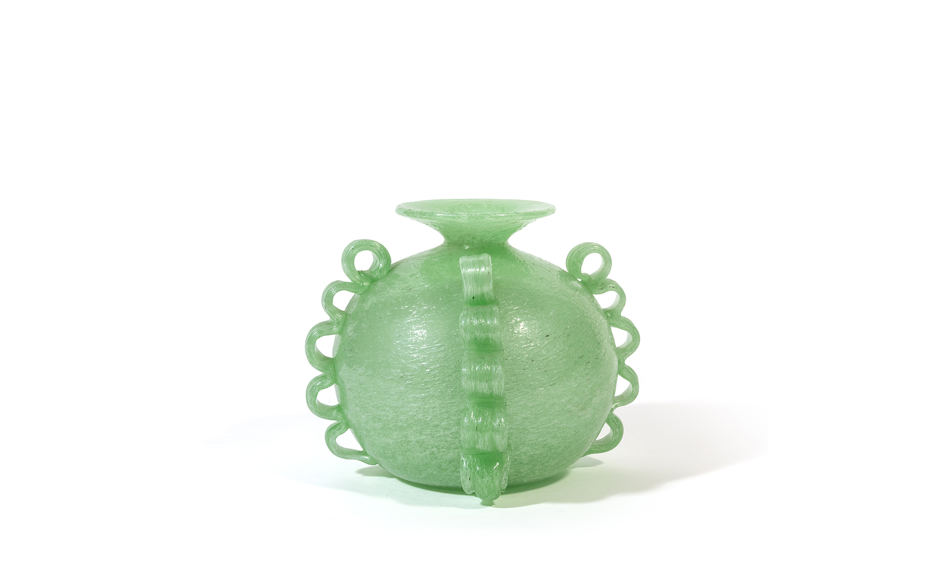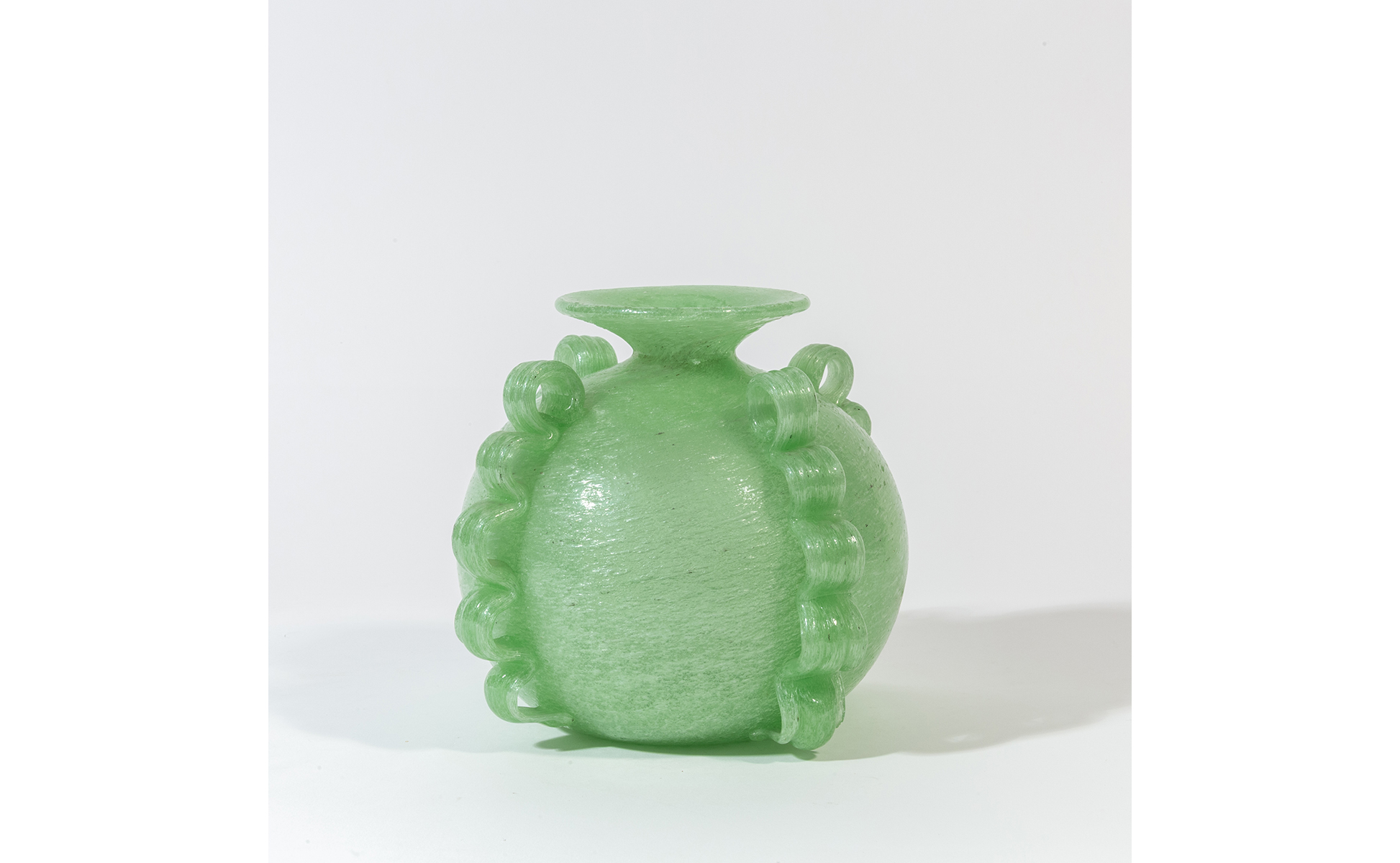 Un vaso in vetro pulegoso verde chiaro con quattro applicazioni laterali ondulate (lieve difetto venatura).