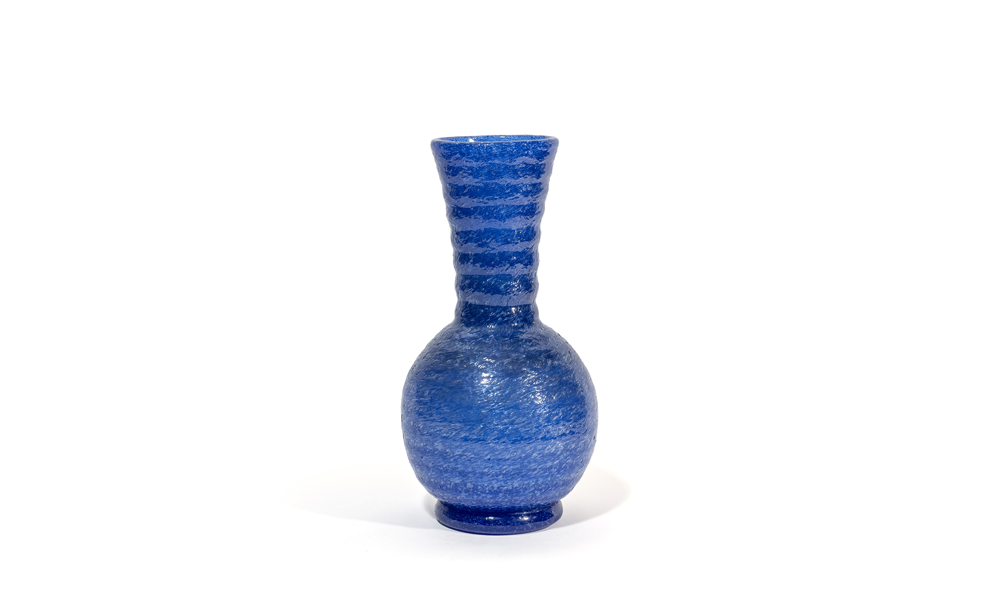 Un vaso in vetro pulegoso blu a profilo ondulato.