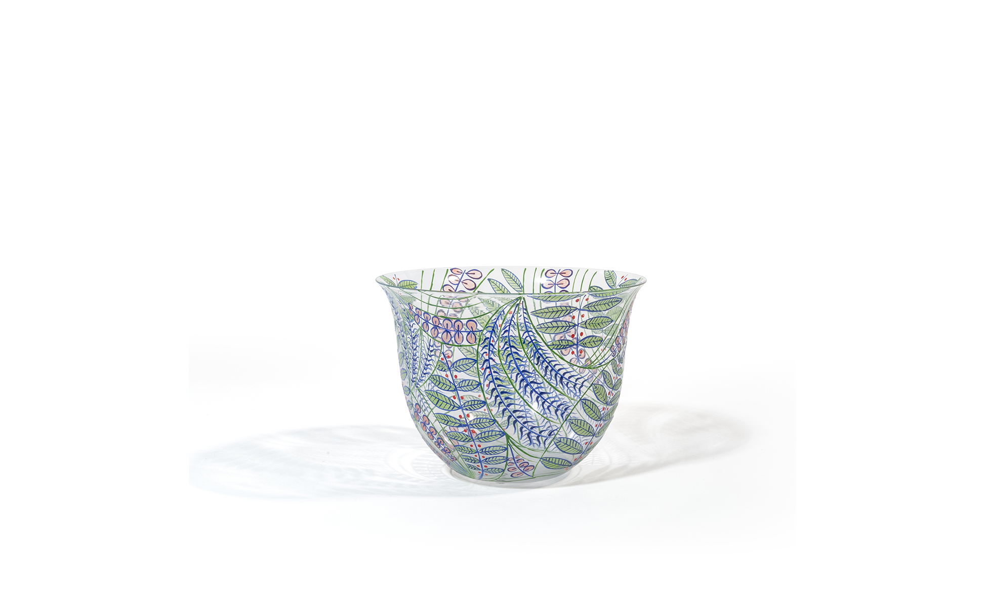 Una coppa in cristallo con decoro di foglie dipinte a smalti policromi.