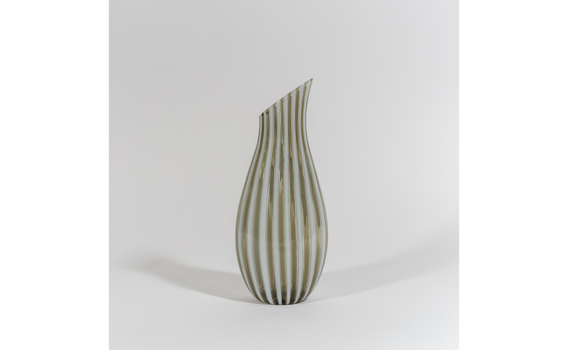 Una brocca in vetro a canne lattimo e grigio.