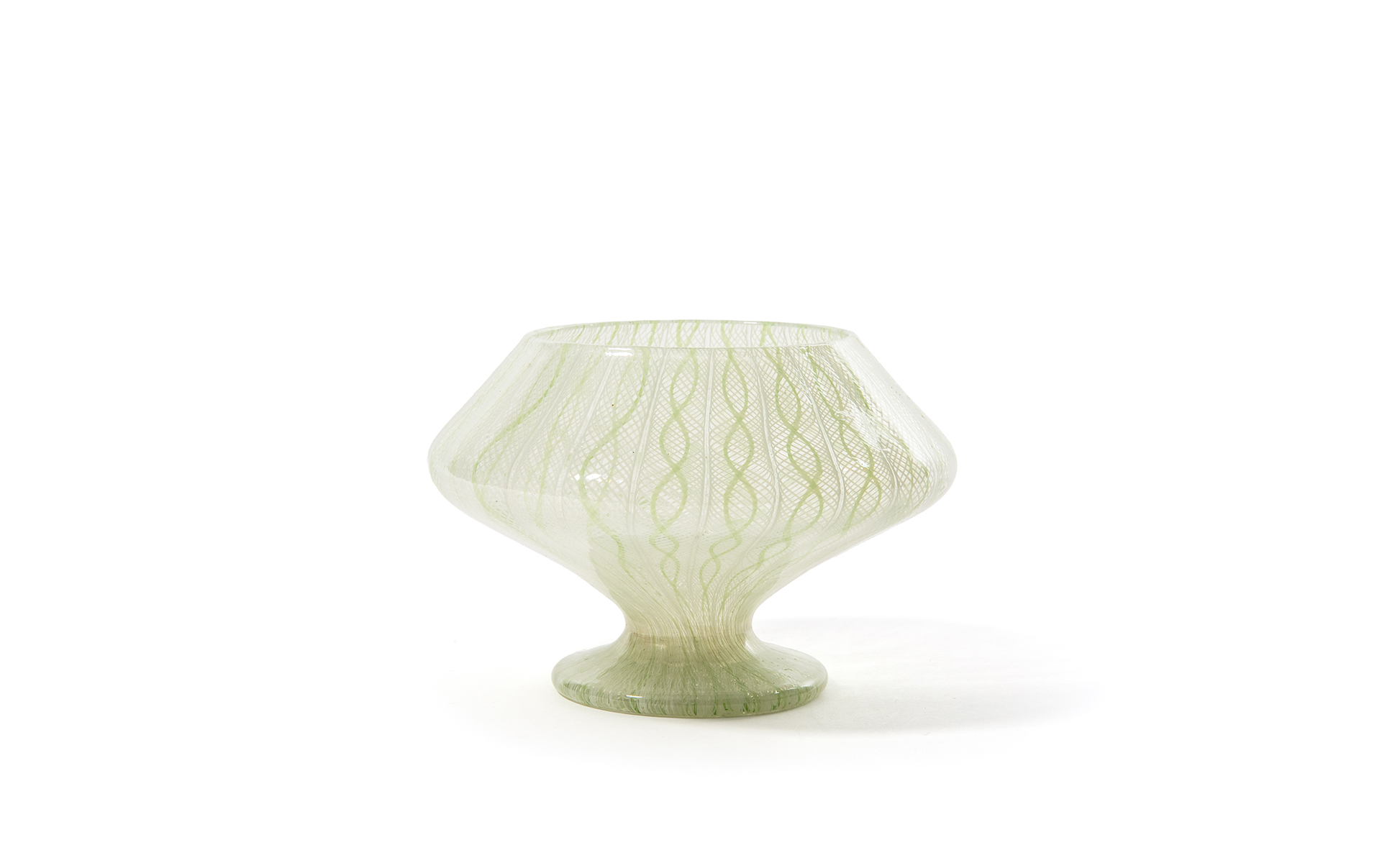 Una coppa in vetro a canne di reticello lattimo e zanfirico verdino.
