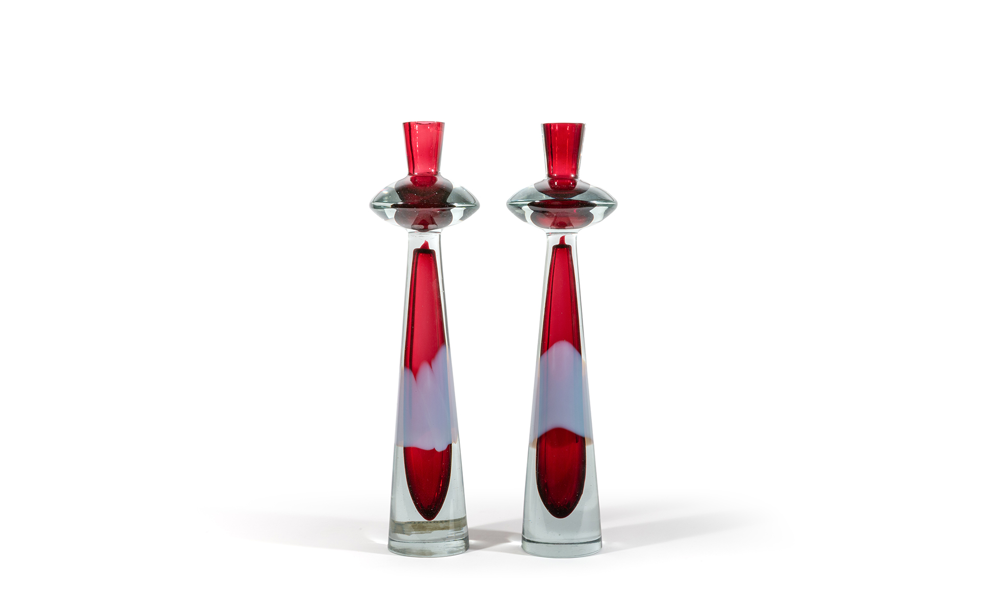 Una coppia di candelieri in vetro sommerso rubino con decoro di fascia centrale opalino.
