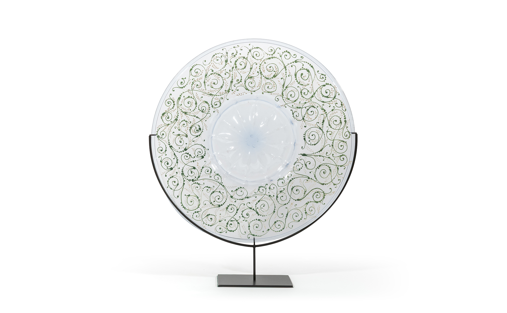 Un piatto di Vittorio Zecchin del 1930 in vetro trasparente bluino decorato a smalti.