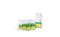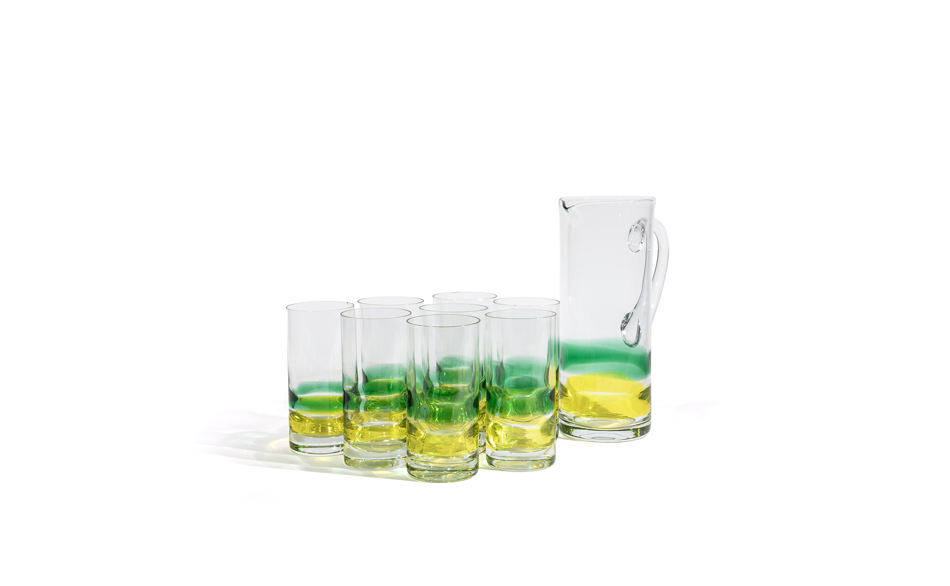 Una caraffa e otto bicchieri in cristallo con decoro di fasce verdi e gialle.