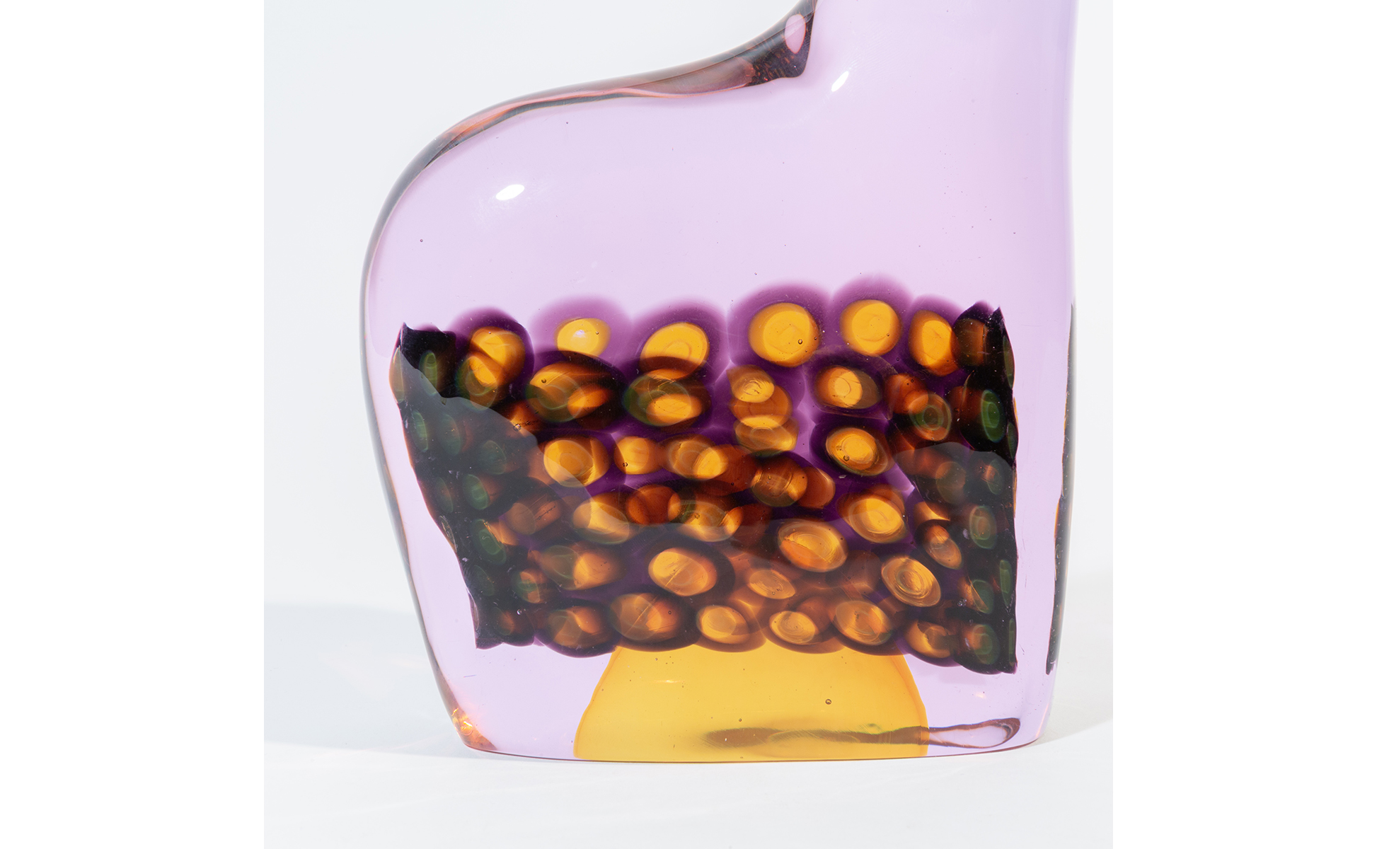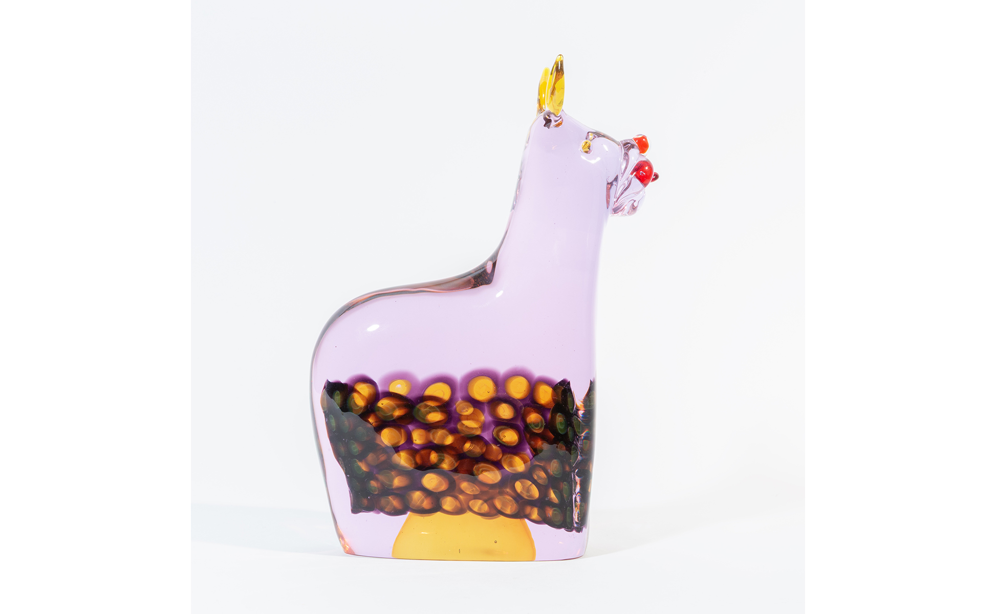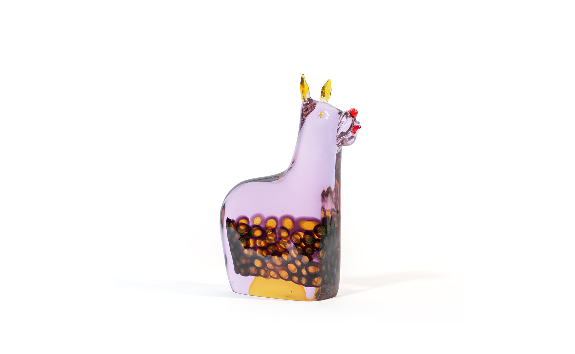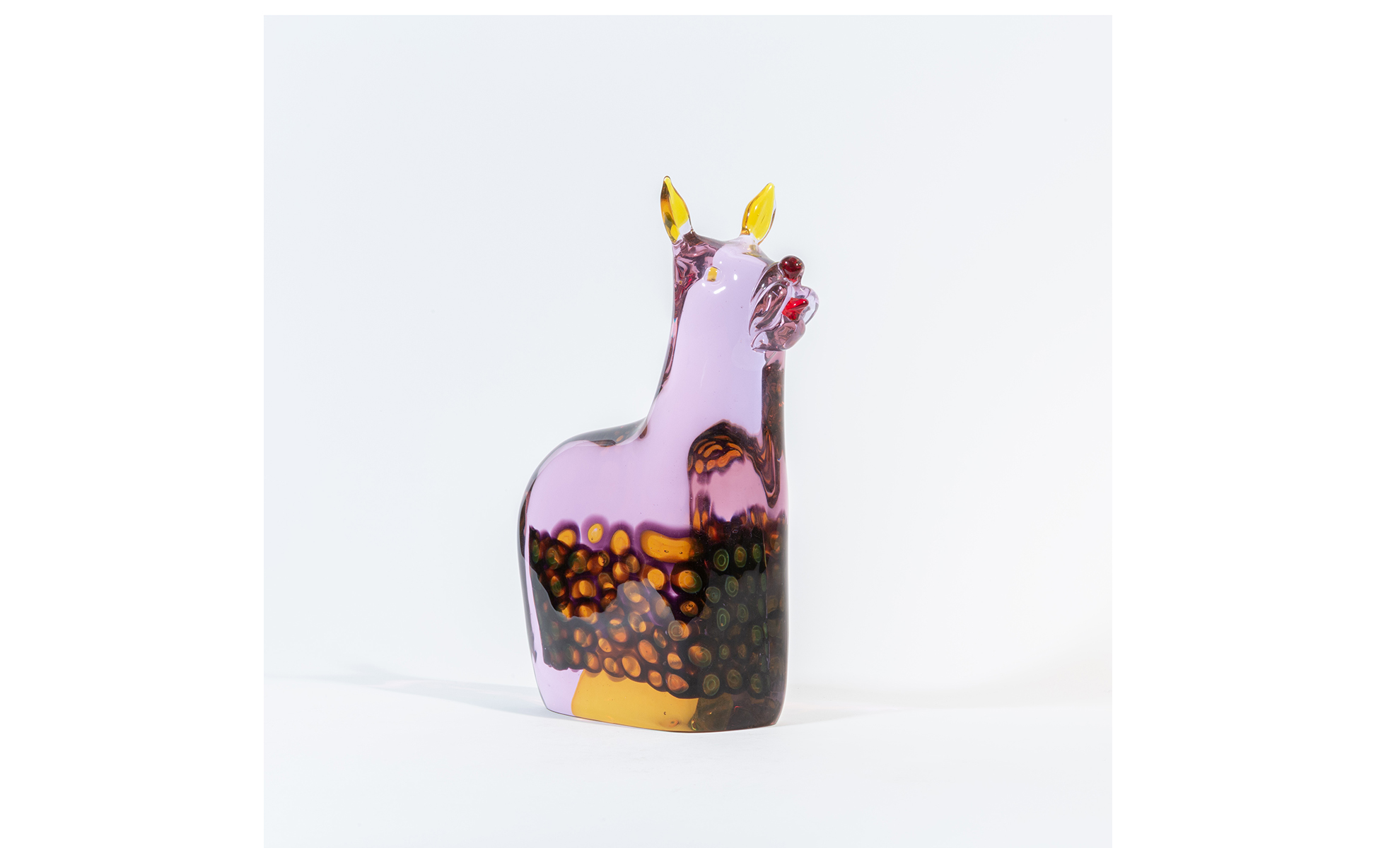Una figura di cane schnauzer in vetro sommerso alessandrite con decoro di murrine.