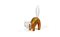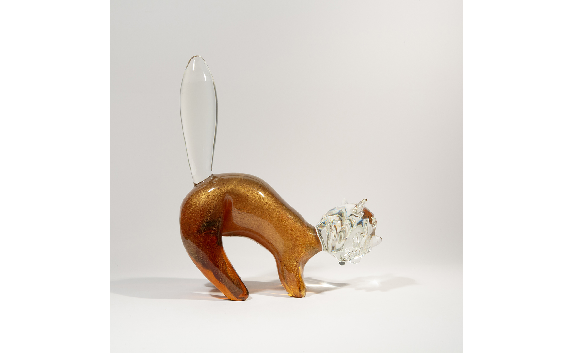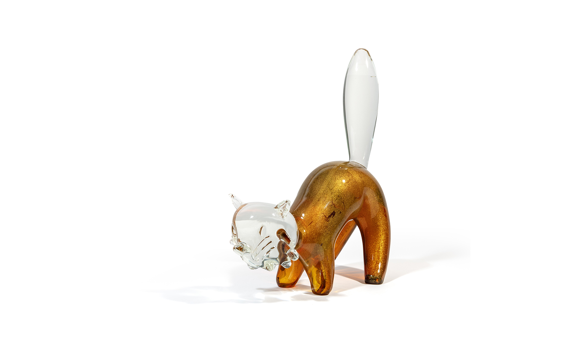 Una figura di gatto con testa e coda in cristallo e corpo in vetro ambra ricoperto da foglia oro.
