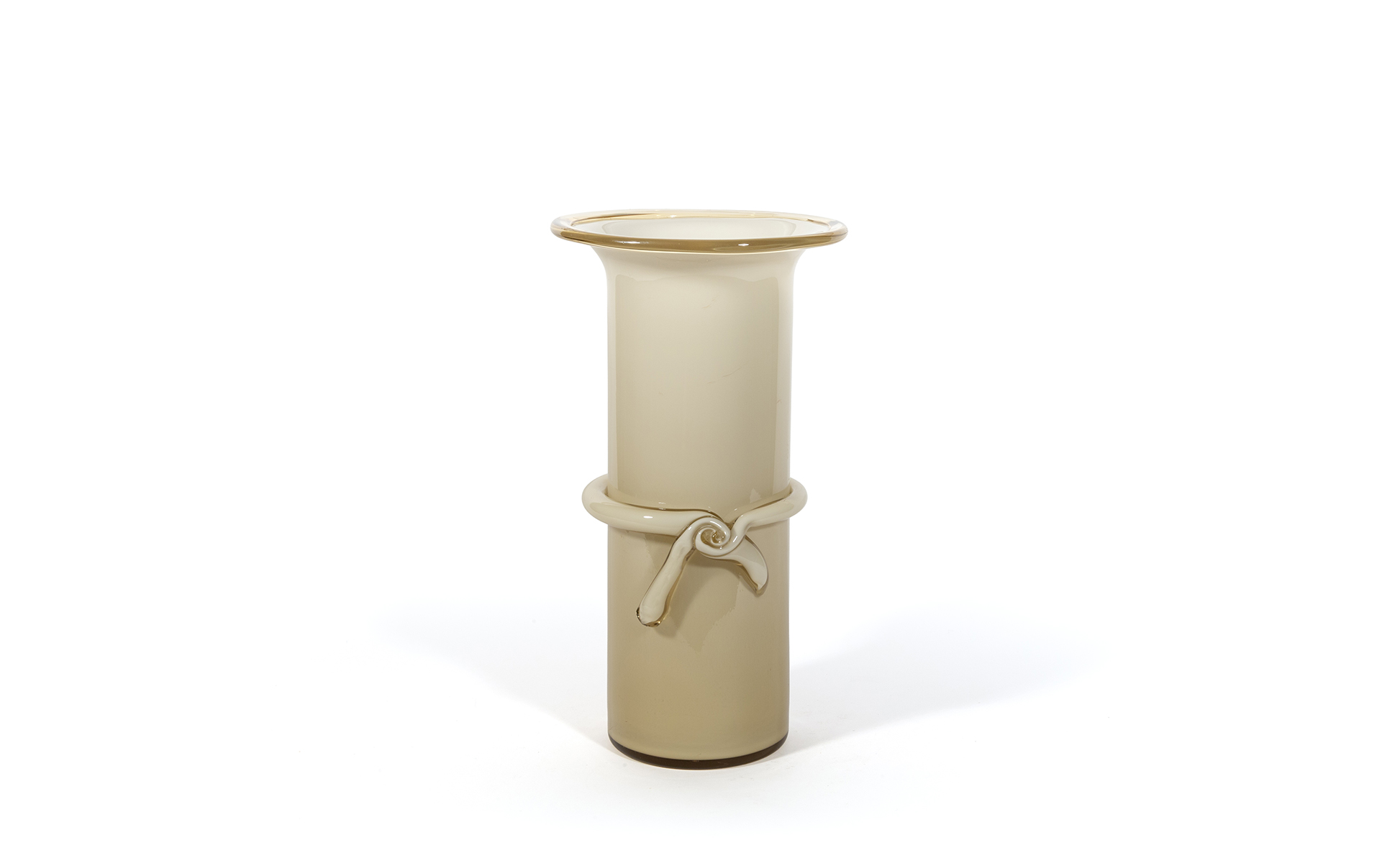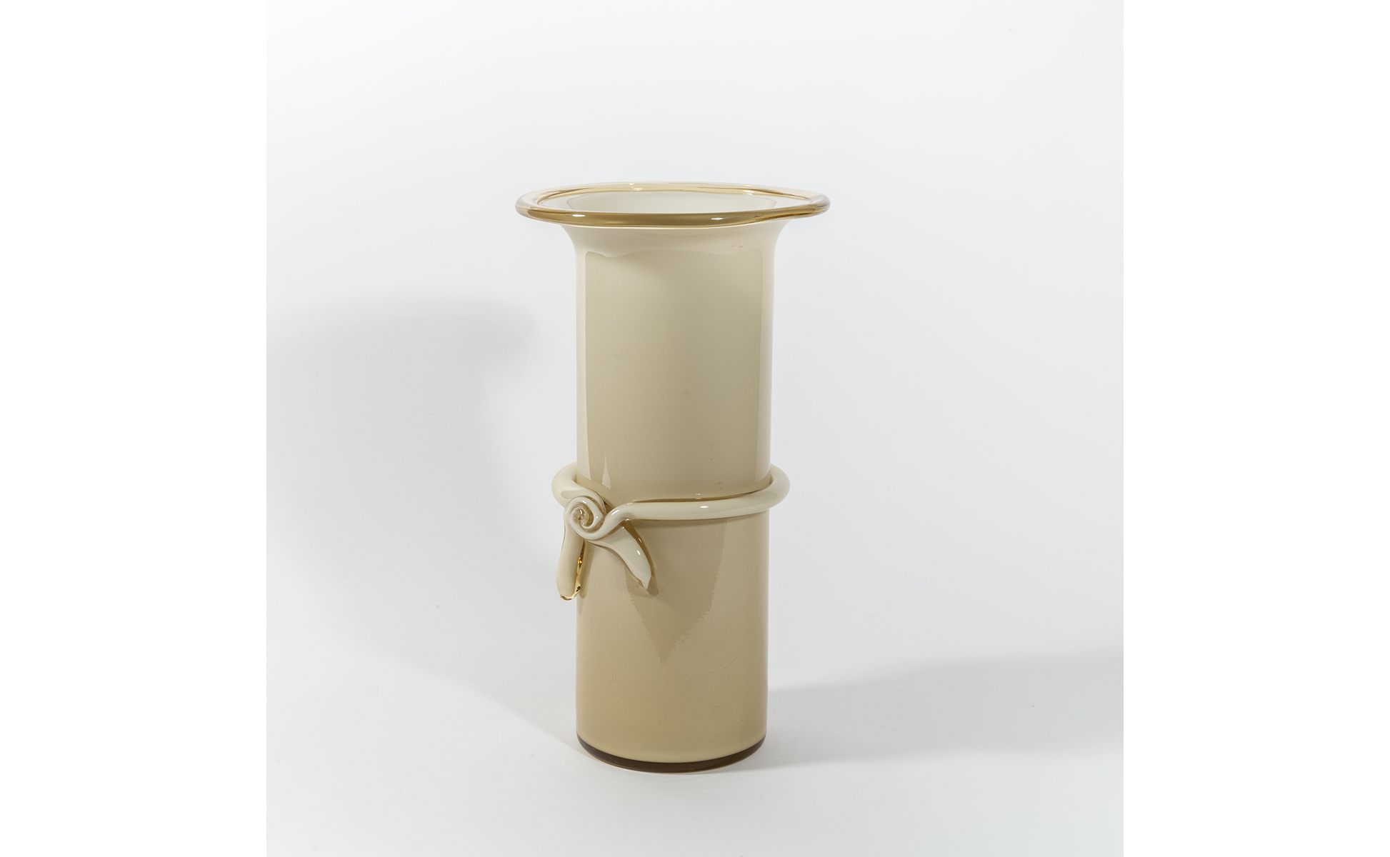 Un vaso cilindrico incamiciato con decoro di cordone intrecciato.