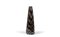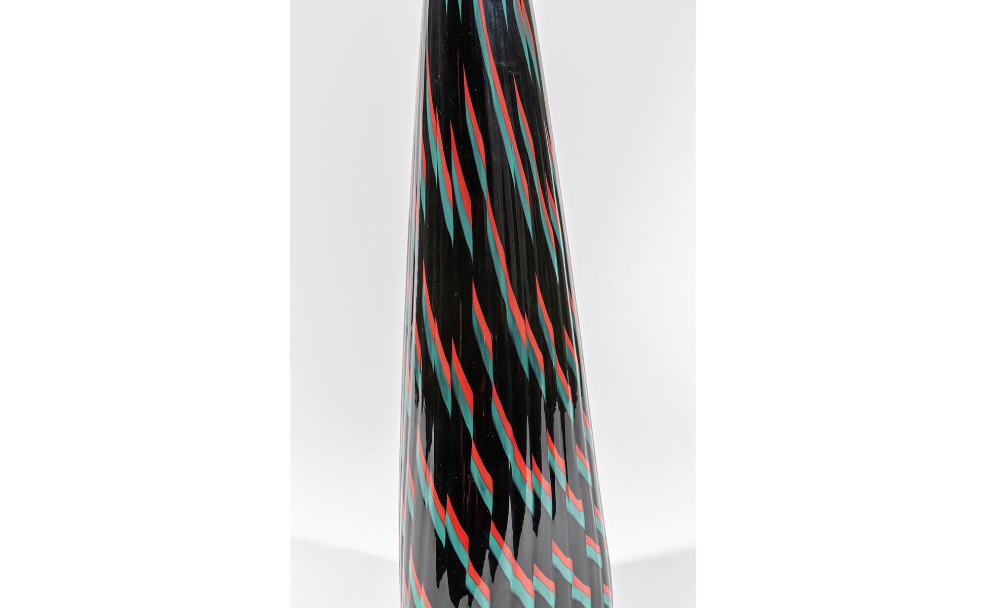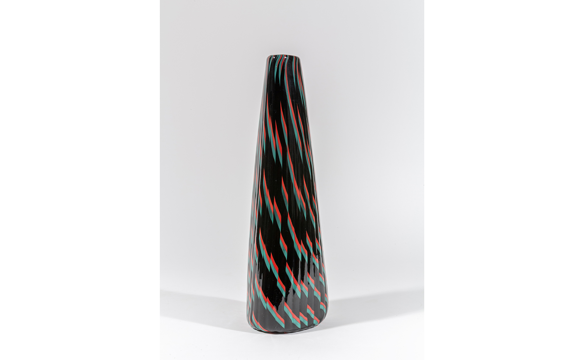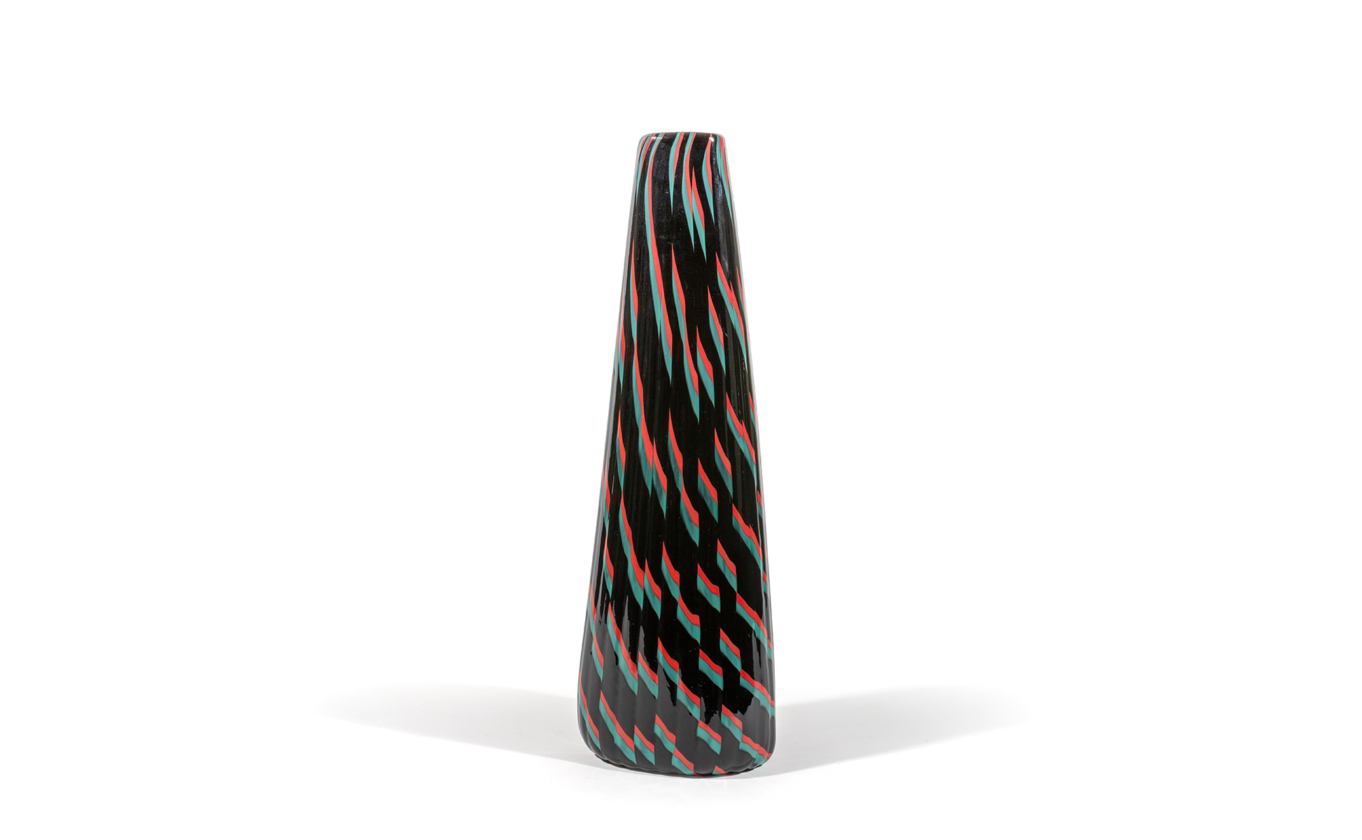 Un vaso in vetro a canne incrociate di filigrana rosse e nere.