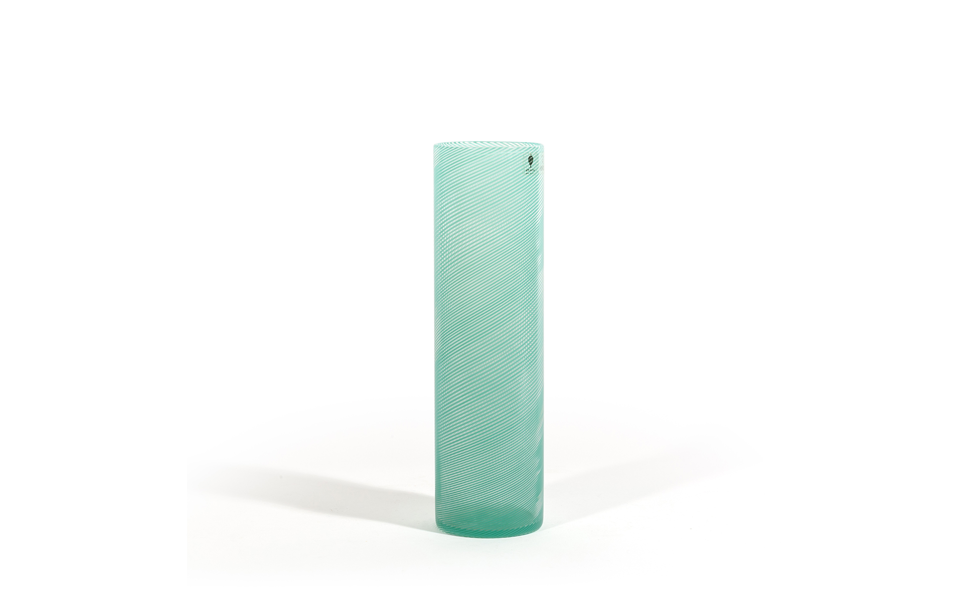 Un vaso cilindrico a filigrana verde due etichette originali.