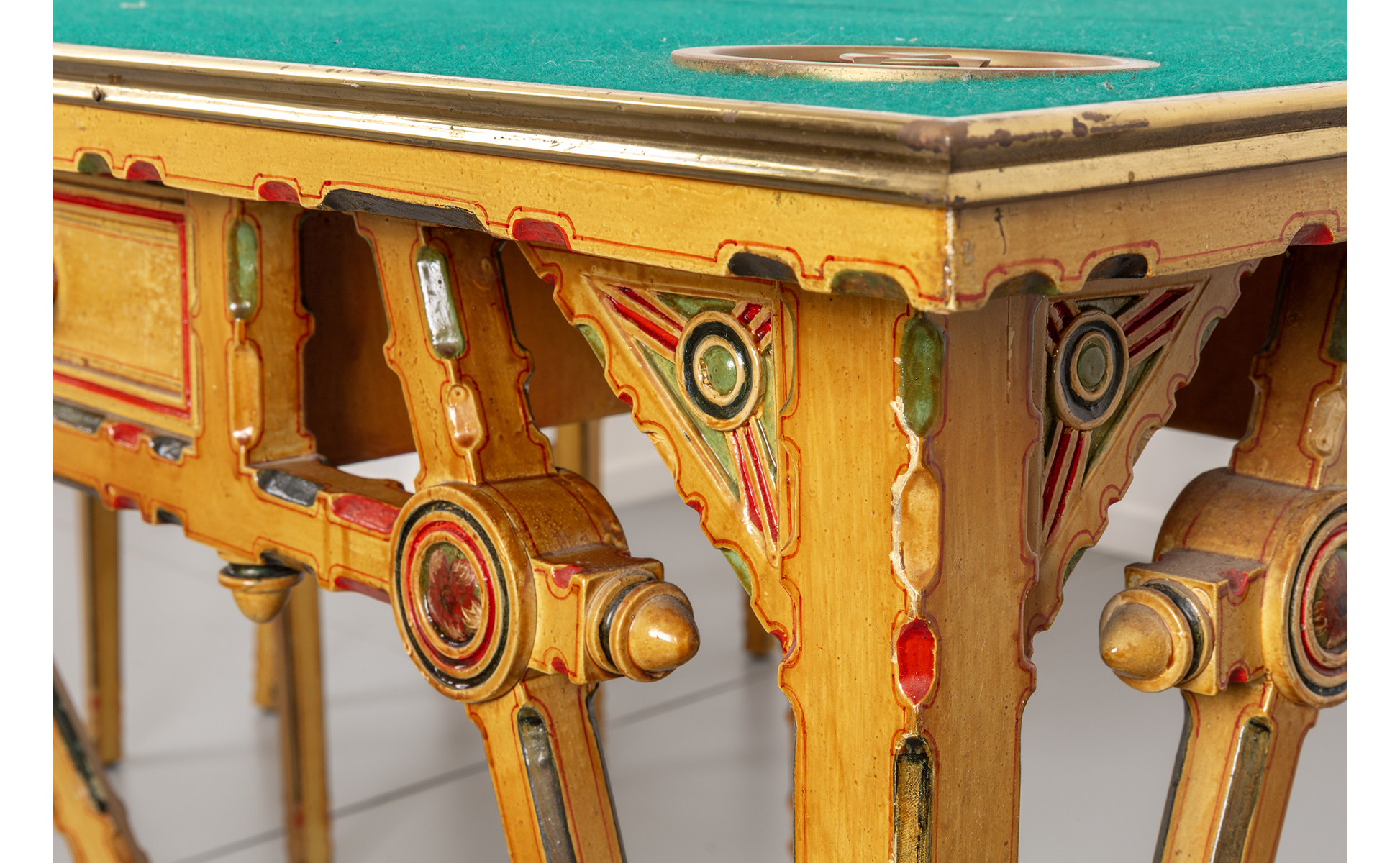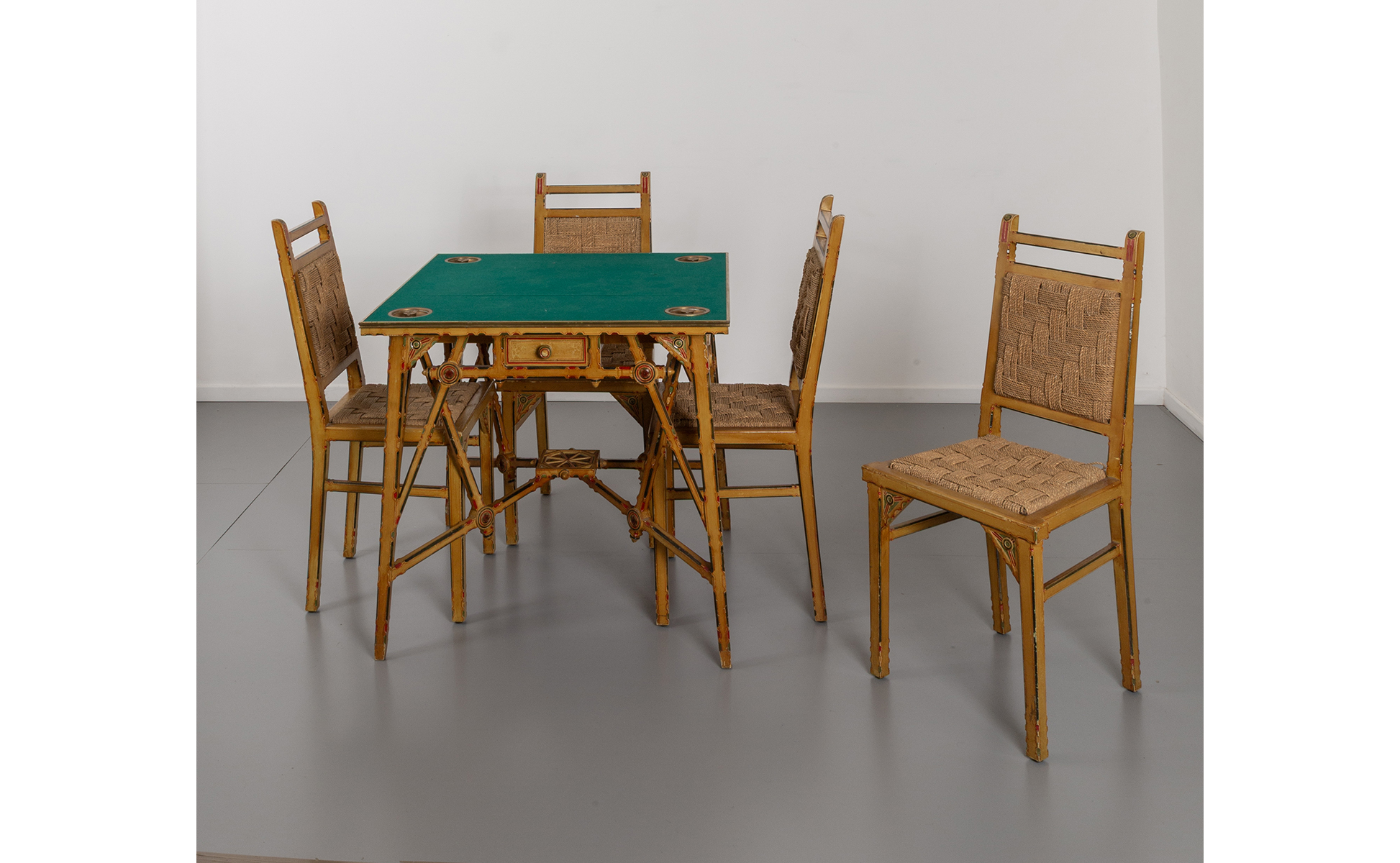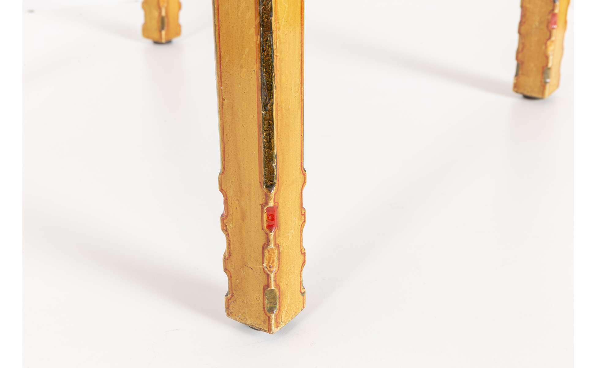 Tavolo (legno decorato piano rivestito in panno ottone): cm 74 (h) x 81 x 81;