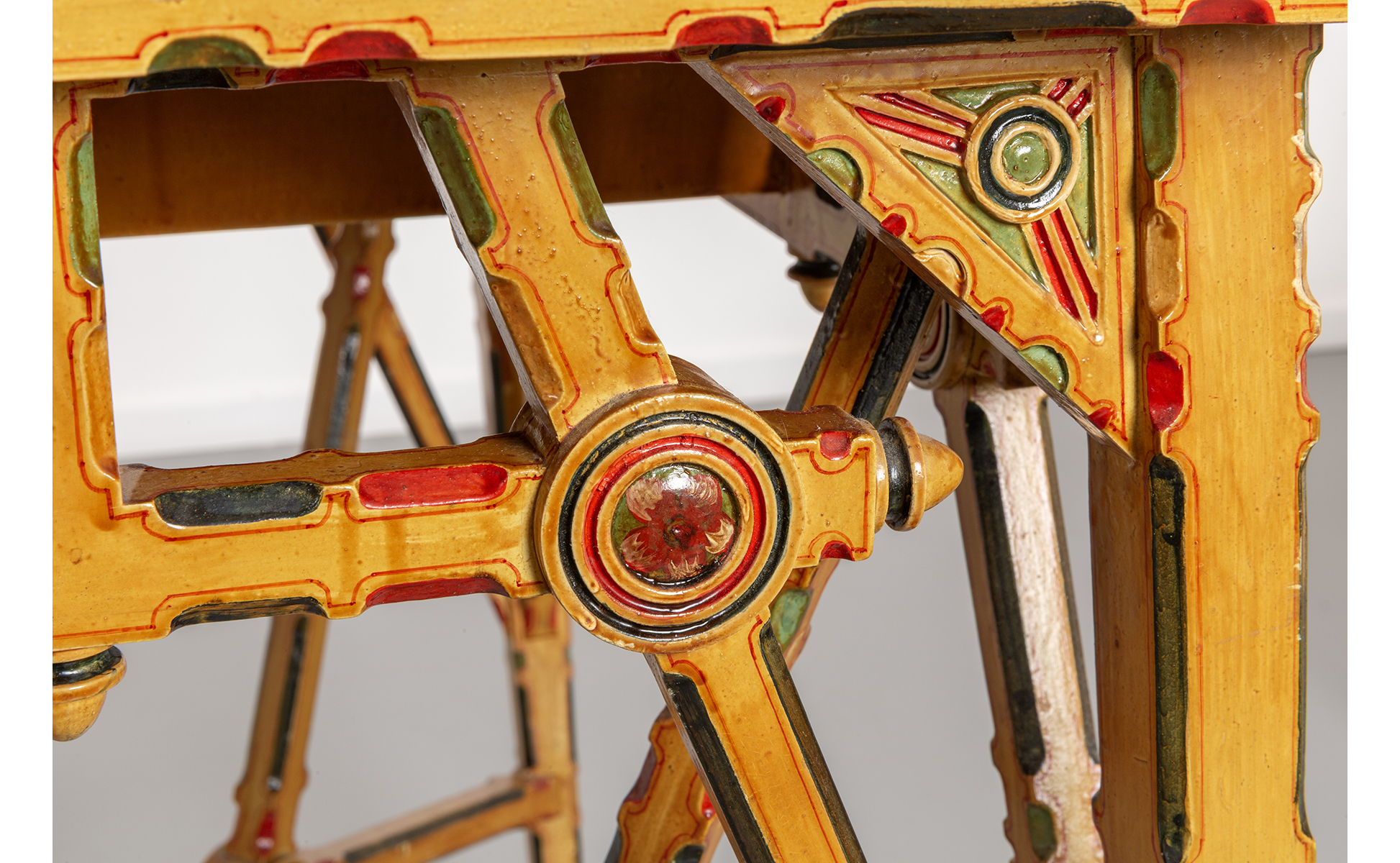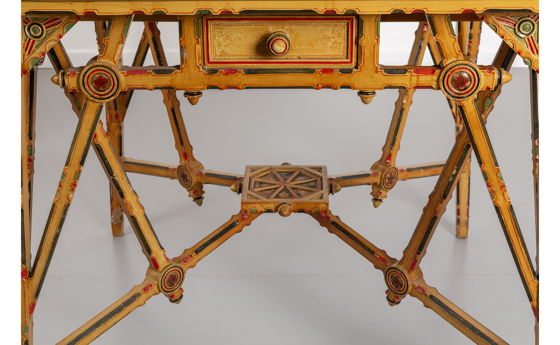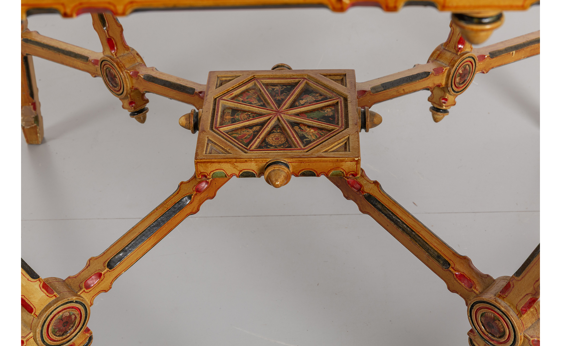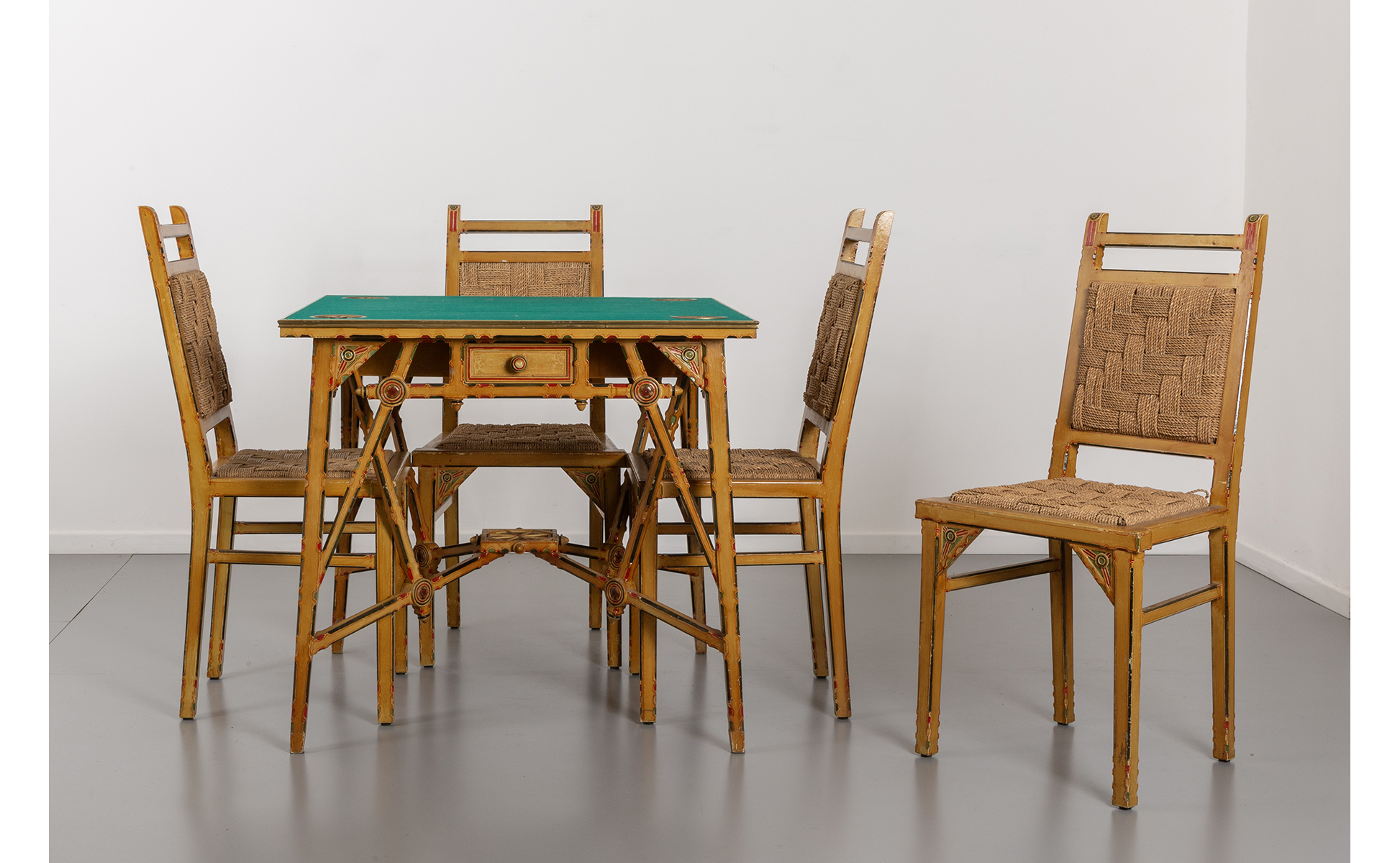 Tavolo (legno decorato piano rivestito in panno ottone): cm 74 (h) x 81 x 81;