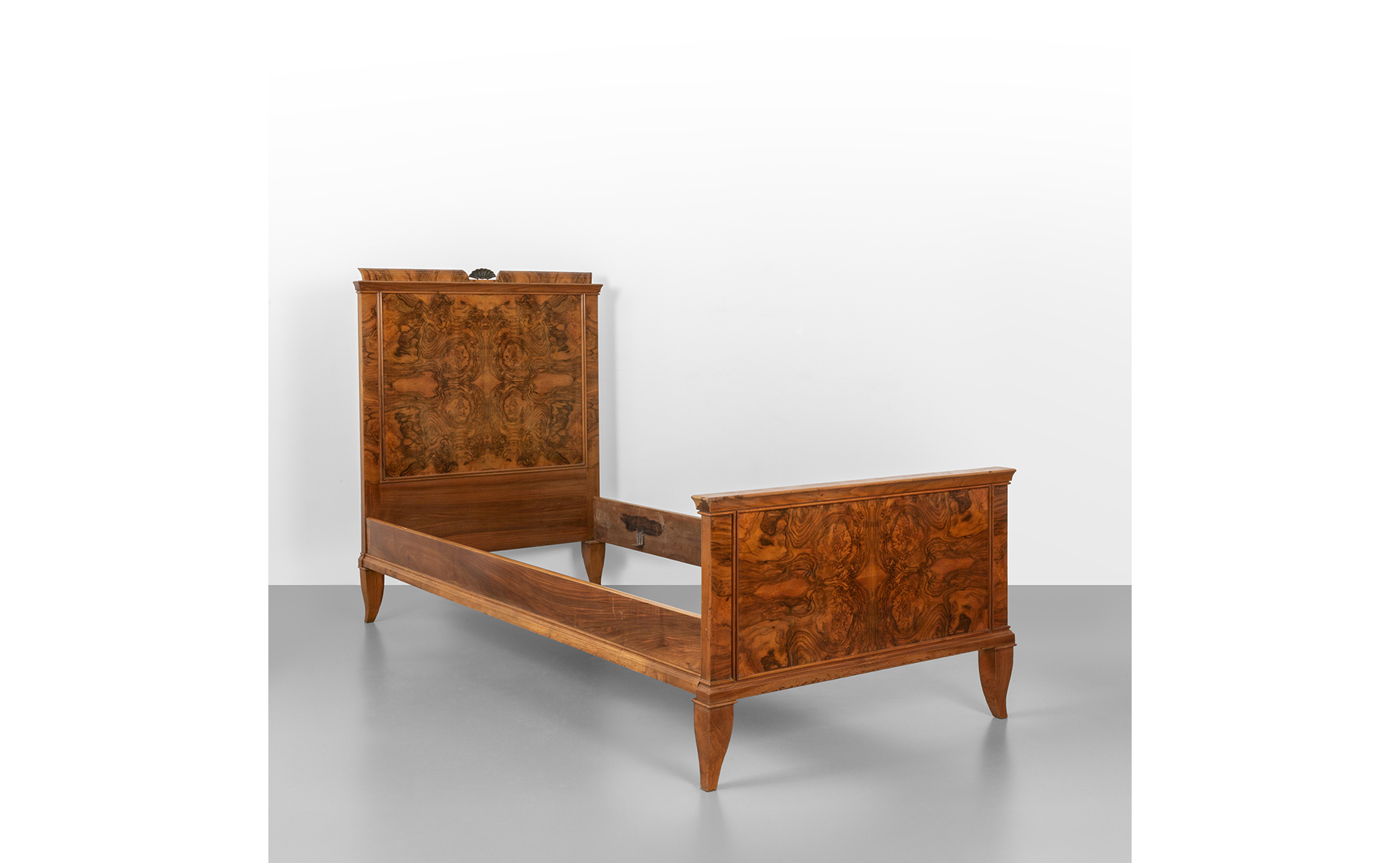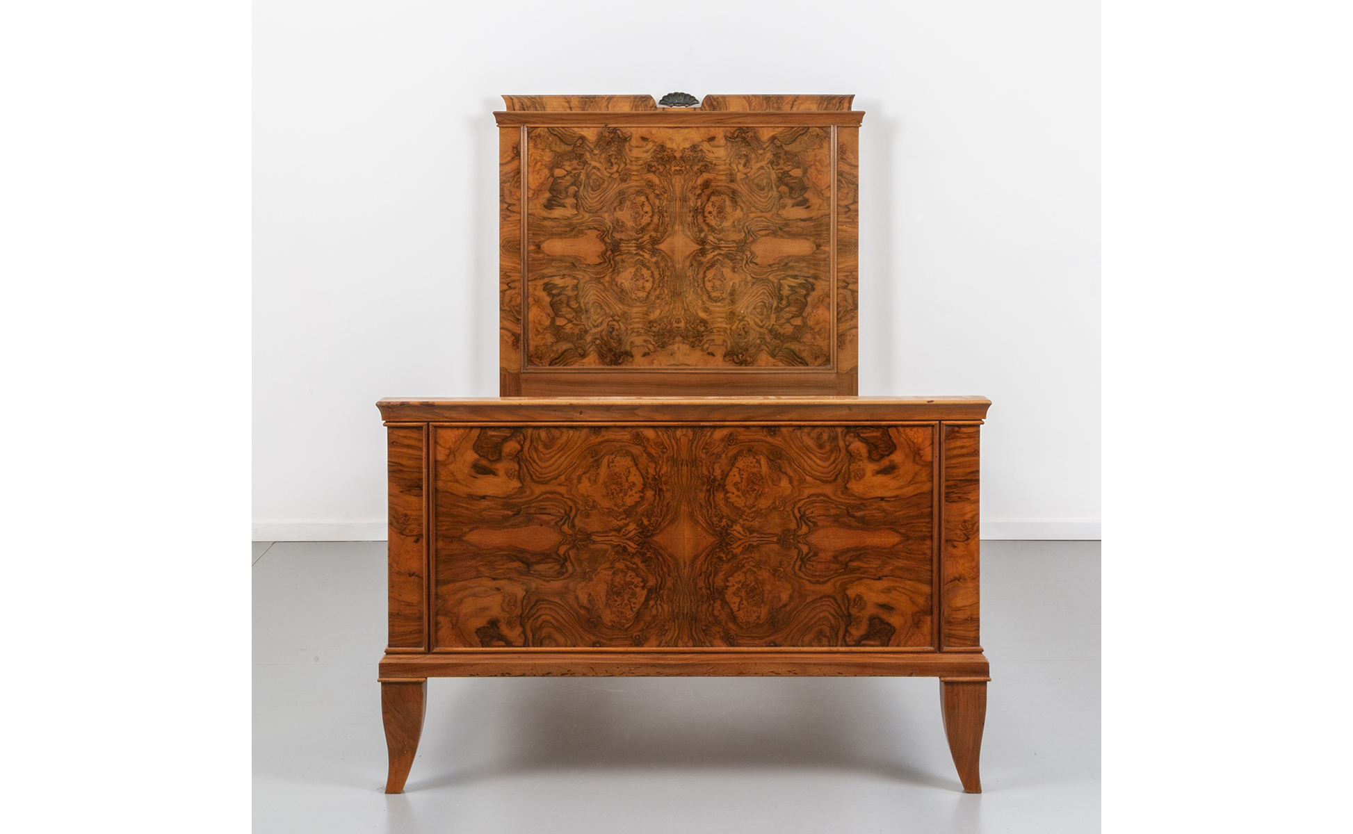 Legno di noce radica di noce testata sormontata da un conchiglia in bronzo.
